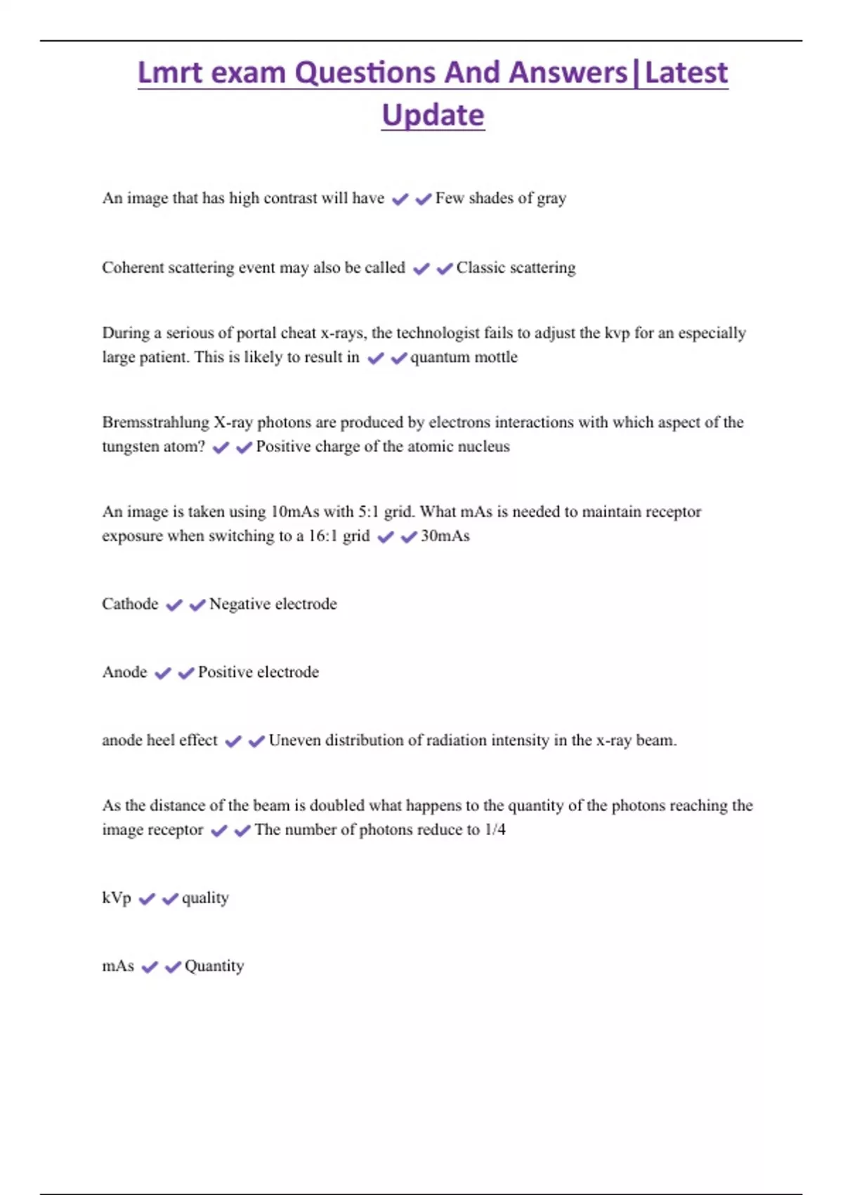 Lmrt exam Questions And Answers|Latest Update An image that has high contrast will have Few shades of gray Coherent scattering event may also be called Classic scattering During a serious of portal cheat x-rays, the technologist fails to adjust the kvp for an especially large patient. This is likely to result in quantum mottle Bremsstrahlung X-ray photons are produced by electrons interactions with which aspect of the tungsten atom? Positive charge of the atomic nucleus An image is taken using 10mAs with 5:1 grid. What mAs is needed to maintain receptor exposure when switching to a 16:1 grid 30mAs
