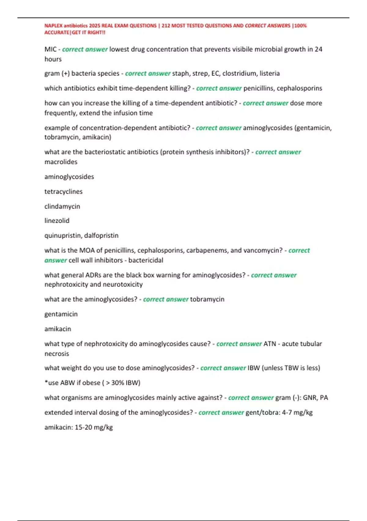 , NAPLEX antibiotics 2025 REAL EXAM QUESTIONS | 212 MOST TESTED QUESTIONS AND CORRECT ANSWERS |100%