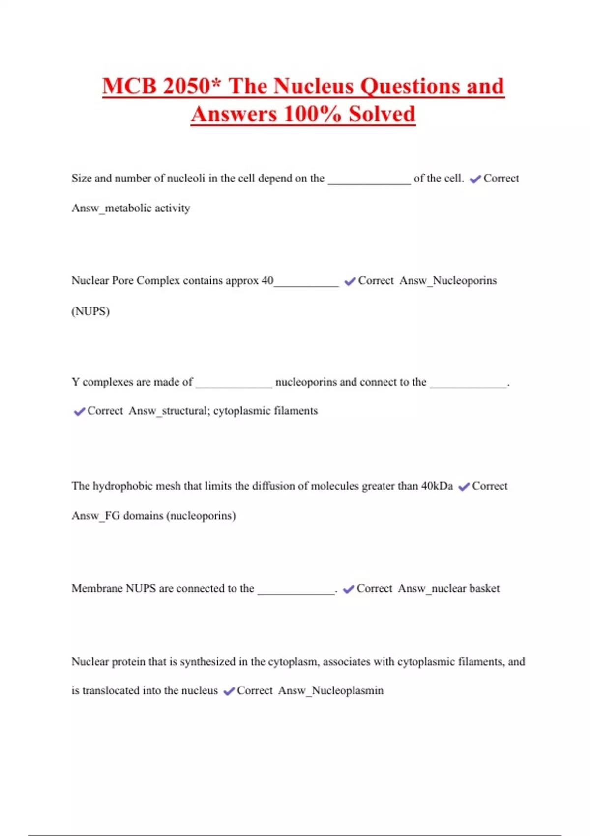 MCB 2050* The Nucleus Questions and Answers 100% Solved Size and number of nucleoli in the cell depend on the ______________ of the cell. Correct Answ_metabolic activity Nuclear Pore Complex contains approx 40___________ Correct Answ_Nucleoporins (NUPS) Y complexes are made of _____________ nucleoporins and connect to the _____________. Correct Answ_structural; cytoplasmic filaments