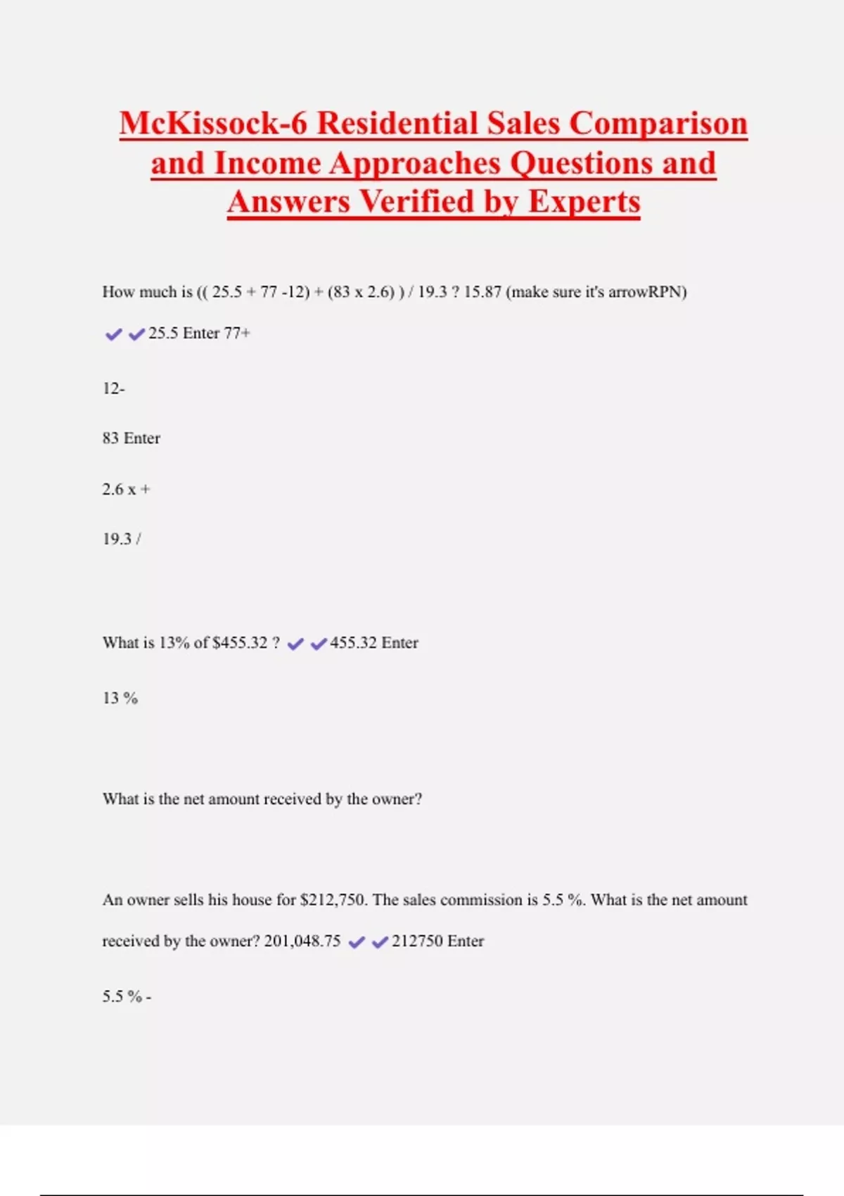 McKissock-6 Residential Sales Comparison and Income Approaches Questions and Answers Verified by Experts How much is (( 25.5 + 77 -12) + (83 x 2.6) ) / 19.3 ? 15.87 (make sure it's arrowRPN) 25.5 Enter 77+ 12- 83 Enter 2.6 x + 19.3 / What is 13% of $455.32 ? 455.32 Enter 13 %