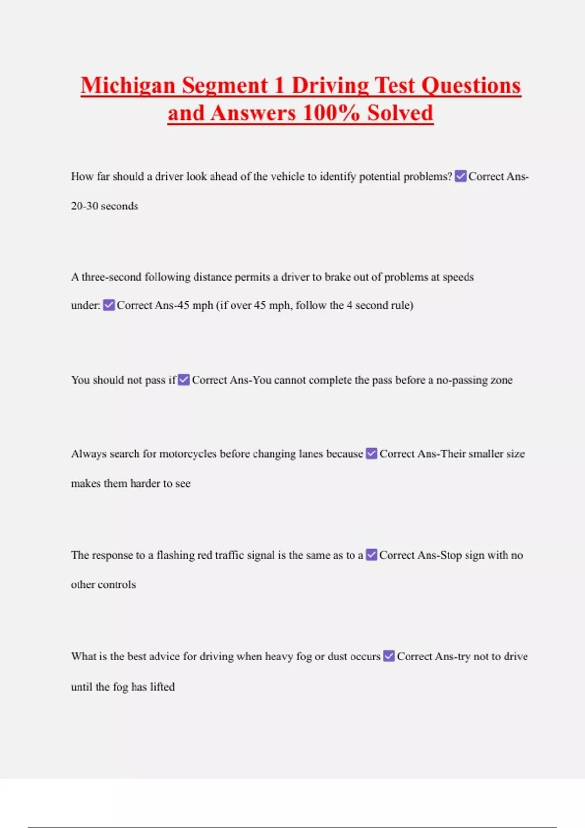 Michigan Segment 1 Driving Test Questions and Answers 100% Solved How far should a driver look ahead of the vehicle to identify potential problems? Correct Ans20-30 seconds A three-second following distance permits a driver to brake out of problems at speeds under: Correct Ans-45 mph (if over 45 mph, follow the 4 second rule) You should not pass if Correct Ans-You cannot complete the pass before a no-passing zone