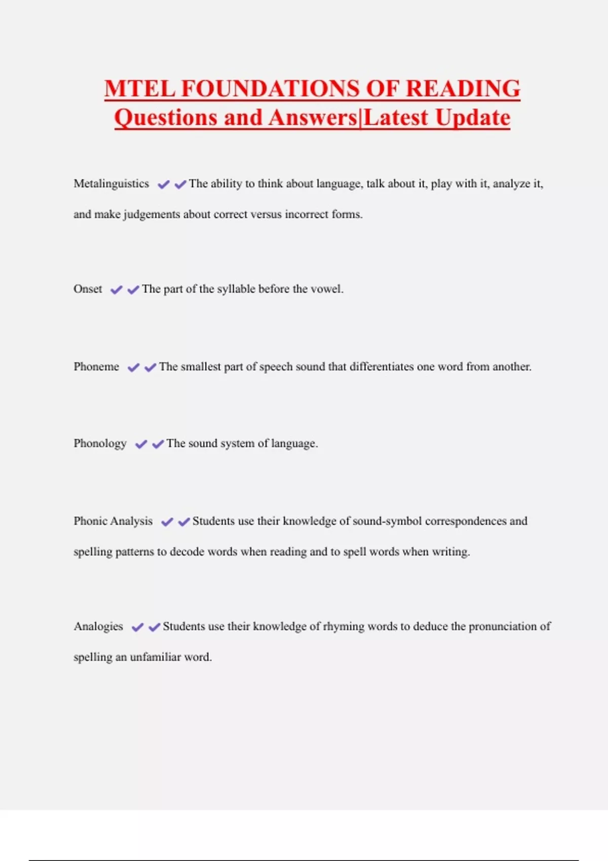 MTEL FOUNDATIONS OF READING Questions and Answers|Latest Update Metalinguistics The ability to think about language, talk about it, play with it, analyze it, and make judgements about correct versus incorrect forms. Onset The part of the syllable before the vowel. Phoneme The smallest part of speech sound that differentiates one word from another. Phonology The sound system of language.