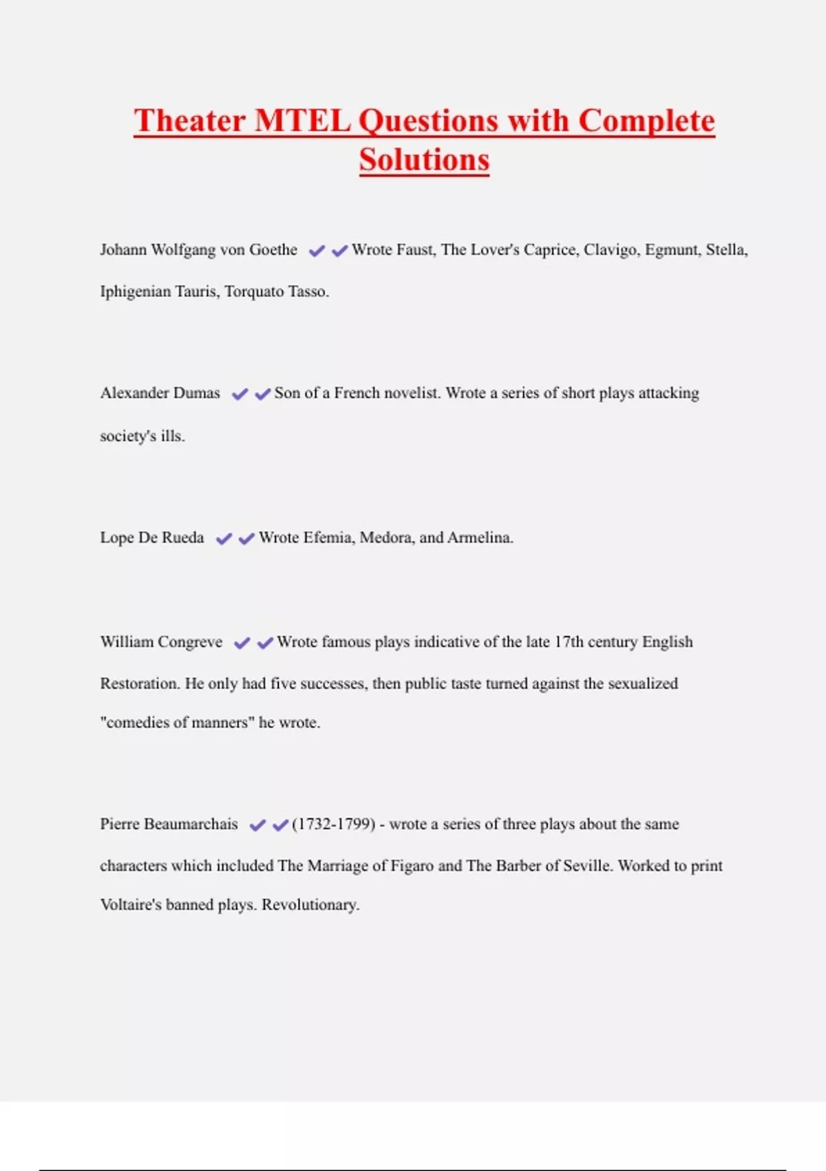 Theater MTEL Questions with Complete Solutions Johann Wolfgang von Goethe Wrote Faust, The Lover's Caprice, Clavigo, Egmunt, Stella, Iphigenian Tauris, Torquato Tasso. Alexander Dumas Son of a French novelist. Wrote a series of short plays attacking society's ills. Lope De Rueda Wrote Efemia, Medora, and Armelina