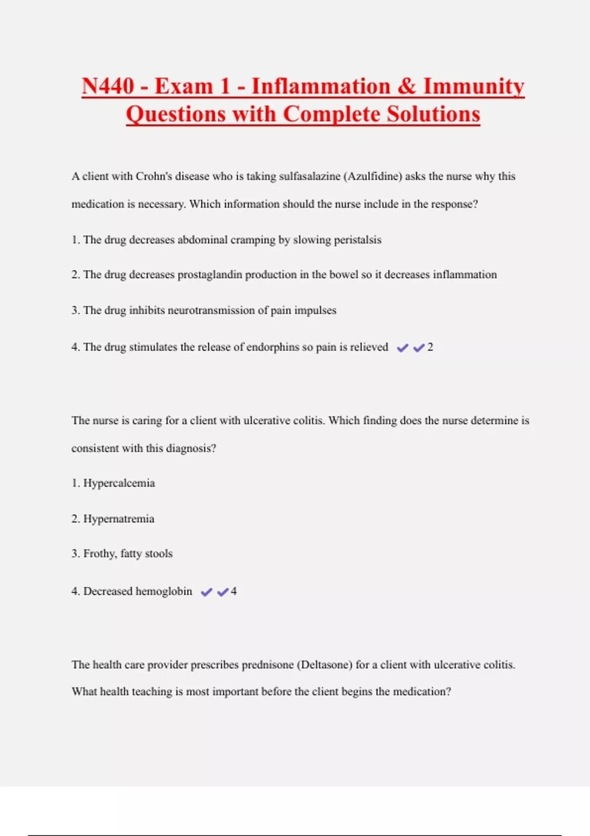 N440 - Exam 1 - Inflammation & Immunity Questions with Complete Solutions A client with Crohn's disease who is taking sulfasalazine (Azulfidine) asks the nurse why this medication is necessary. Which information should the nurse include in the response? 1. The drug decreases abdominal cramping by slowing peristalsis 2. The drug decreases prostaglandin production in the bowel so it decreases inflammation 3. The drug inhibits neurotransmission of pain impulses 4. The drug stimulates the release of endorphins so pain is relieved 2