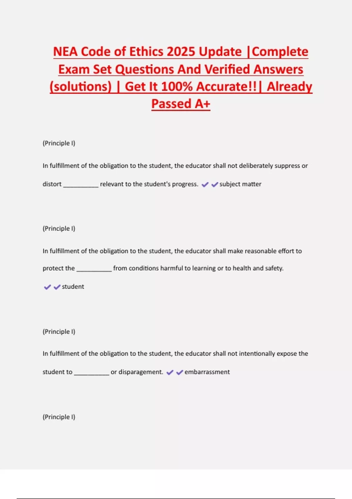 NEA Code of Ethics 2025 Update |Complete Exam Set Questions And Verified Answers (solutions) | Get It 100% Accurate!!| Already Passed A+