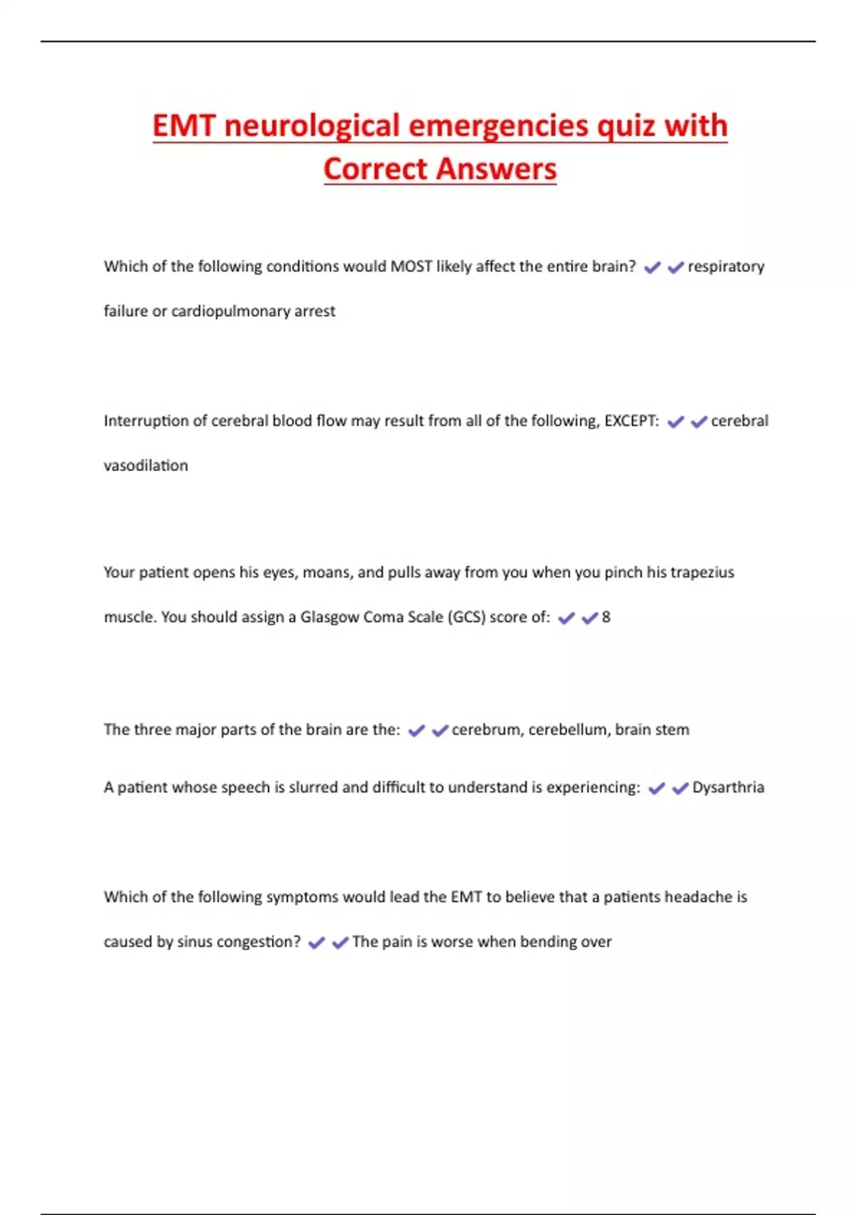 EMT neurological emergencies quiz with Correct Answers Which of the following conditions would MOST likely affect the entire brain? respiratory failure or cardiopulmonary arrest Interruption of cerebral blood flow may result from all of the following, EXCEPT: cerebral vasodilation Your patient opens his eyes, moans, and pulls away from you when you pinch his trapezius muscle. You should assign a Glasgow Coma Scale (GCS) score of: 8