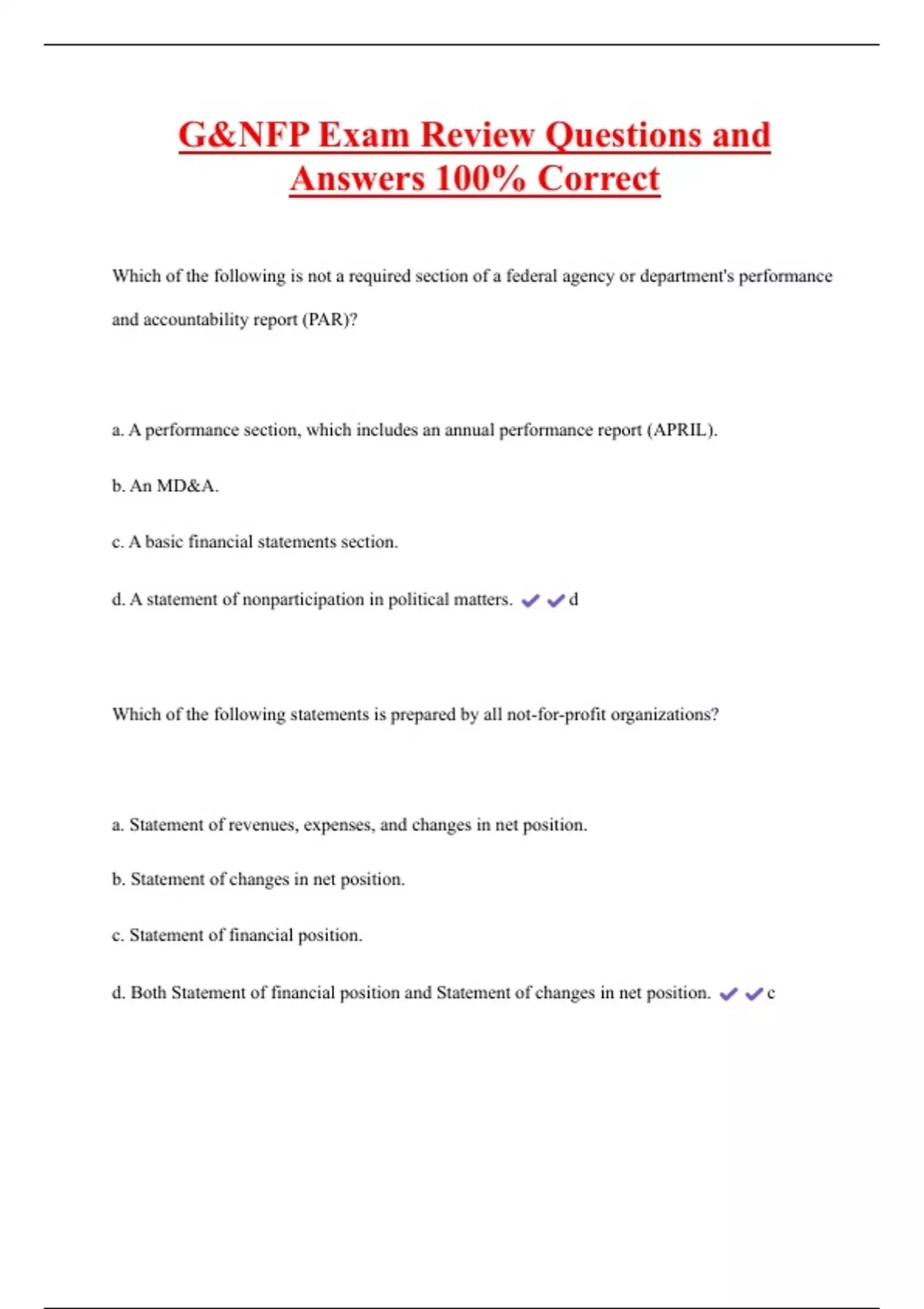 G&NFP Exam Review Questions and Answers 100% Correct Which of the following is not a required section of a federal agency or department's performance and accountability report (PAR)? a. A performance section, which includes an annual performance report (APRIL). b. An MD&A. c. A basic financial statements section. d. A statement of nonparticipation in political matters. d
