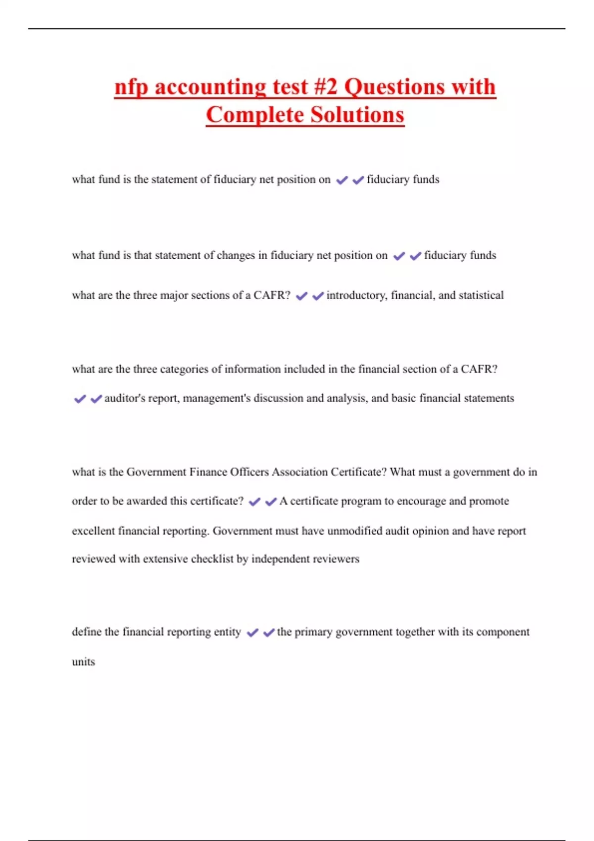 nfp accounting test #2 Questions with Complete Solutions what fund is the statement of fiduciary net position on fiduciary funds what fund is that statement of changes in fiduciary net position on fiduciary funds what are the three major sections of a CAFR? introductory, financial, and statistical what are the three categories of information included in the financial section of a CAFR? auditor's report, management's discussion and analysis, and basic financial statements