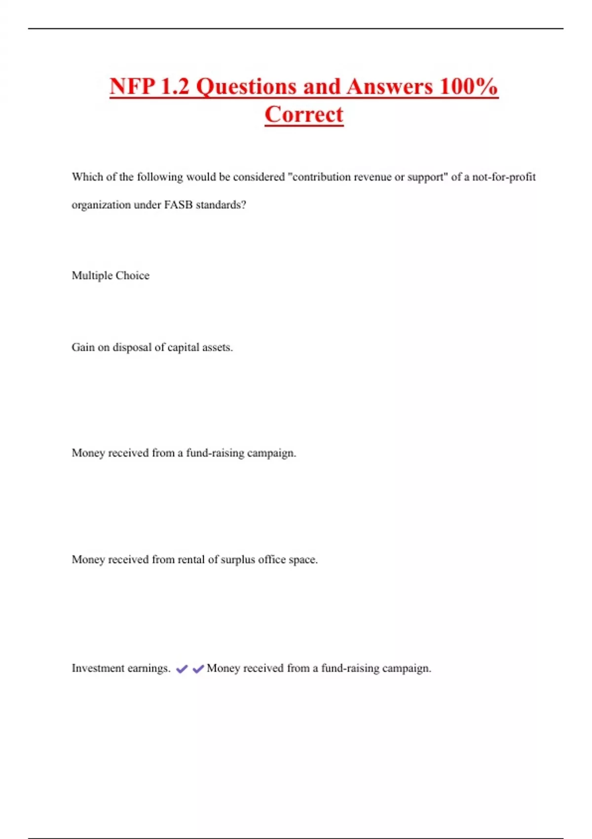 NFP 1.2 Questions and Answers 100% Correct Which of the following would be considered "contribution revenue or support" of a not-for-profit organization under FASB standards? Multiple Choice Gain on disposal of capital assets