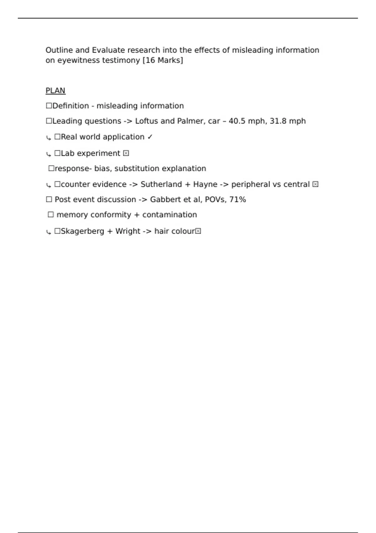 PLAN + ESSAY Outline and Evaluate research into the effects of misleading information on eyewitness testimony