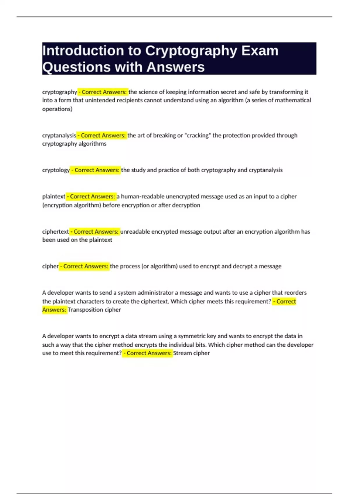 Introduction to Cryptography Exam Questions with Answers cryptography - Correct Answers: the science of keeping information secret and safe by transforming it into a form that unintended recipients cannot understand using an algorithm (a series of mathematical operations) cryptanalysis - Correct Answers: the art of breaking or "cracking" the protection provided through cryptography algorithms cryptology - Correct Answers: the study and practice of both cryptography and cryptanalysis plaintext - Correct Answers: a human-readable unencrypted message used as an input to a cipher (encryption algorithm) before encryption or after decryption ciphertext - Correct Answers: unreadable encrypted message output after an encryption algorithm has been used on the plaintext cipher - Correct Answers: the process (or algorithm) used to encrypt and decrypt a message A developer wants to send a system administrator a message and wants to use a cipher that reorders the plaintext characters to create the ciphertext. Which cipher meets this requirement? - Correct Answers: Transposition cipher A developer wants to encrypt a data stream using a symmetric key and wants to encrypt the data in such a way that the cipher method encrypts the individual bits. Which cipher method can the developer use to meet this requirement? - Correct Answers: Stream cipher