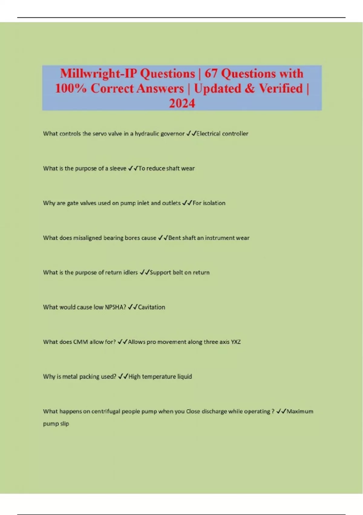 Millwright-IP Questions | 67 Questions with 100% Correct Answers | Updated & Verified | 202