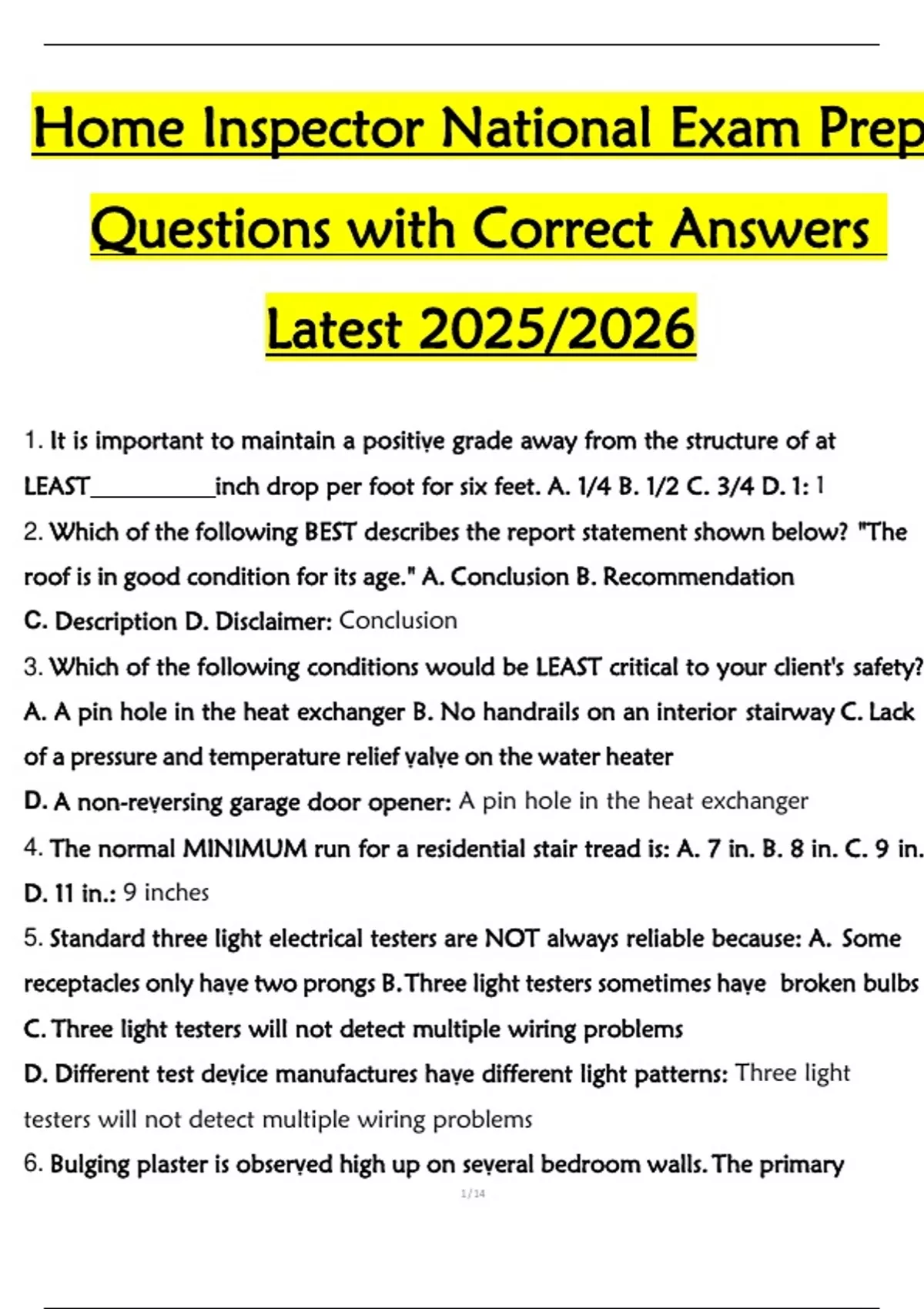 Home Inspector National Exam Prep Questions with Correct Answers Latest 2025/2026 1. Home inspector exam prep study guide 2025 2. Practice questions for national home inspector test 3. Home inspection certification exam tips 4. Best online course for home inspector licensing 5. Home inspector exam sample questions with answers 6. How to pass the home inspector exam on first try 7. National home inspector exam study materials 2026 8. Free home inspector practice test questions 9. Home inspection exam prep course reviews 10. Latest updates for home inspector certification exam 11. Home inspector exam flashcards and study aids 12. Step-by-step guide to becoming a certified home inspector 13. Home inspector exam difficulty level and pass rate 14. Top-rated home inspector exam prep books 15. Home inspection exam question types and format 16. Time management strategies for home inspector test 17. Home inspector exam retake policy and requirements 18. State-specific home inspector licensing exam prep 19. Home inspector exam prep mobile apps 20. Common mistakes to avoid on home inspector certification test 21. Home inspector exam scoring system explained 22. Continuing education for licensed home inspectors 23. Home inspector exam prep for career changers 24. Video tutorials for national home inspector exam 25. Home inspector exam prep weekend crash course