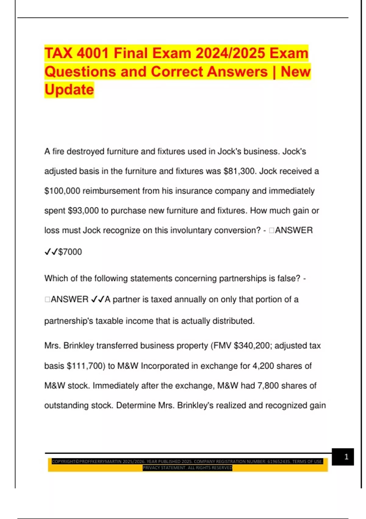 TAX 4001 Final Exam 2024/2025 Exam Questions and Correct Answers | New Update
