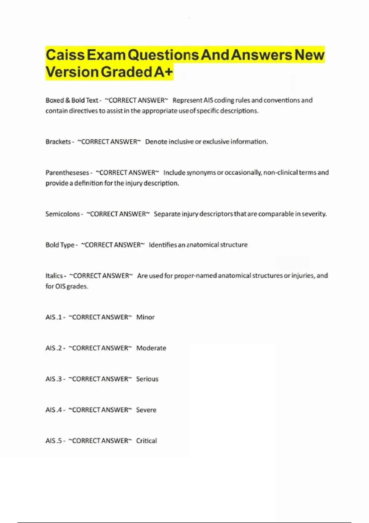Caiss Exam Questions And Answers New Version Graded A+ Boxed & Bold Text - ~CORRECT ANSWER~ Represent AIS coding rules and conventions and contain directives to assist in the appropriate use of specific descriptions. Brackets - ~CORRECT ANSWER~ Denote inclusive or exclusive information. Parentheseses - ~CORRECT ANSWER~ Include synonyms or occasionally, non-clinical terms and provide a definition for the injury description. Semicolons - ~CORRECT ANSWER~ Separate injury descriptors that are comparable in severity. Bold Type - ~CORRECT ANSWER~ Identifies an anatomical structure Italics - ~CORRECT ANSWER~ Are used for proper-named anatomical structures or injuries, and for OIS grades. AIS .1 - ~CORRECT ANSWER~ Minor AIS .2 - ~CORRECT ANSWER~ Moderate AIS .3 - ~CORRECT ANSWER~ Serious AIS .4 - ~CORRECT ANSWER~ Severe AIS .5 - ~CORRECT ANSWER~ Critical AIS .6 - ~CORRECT ANSWER~ Maximum Range of AIS severity co