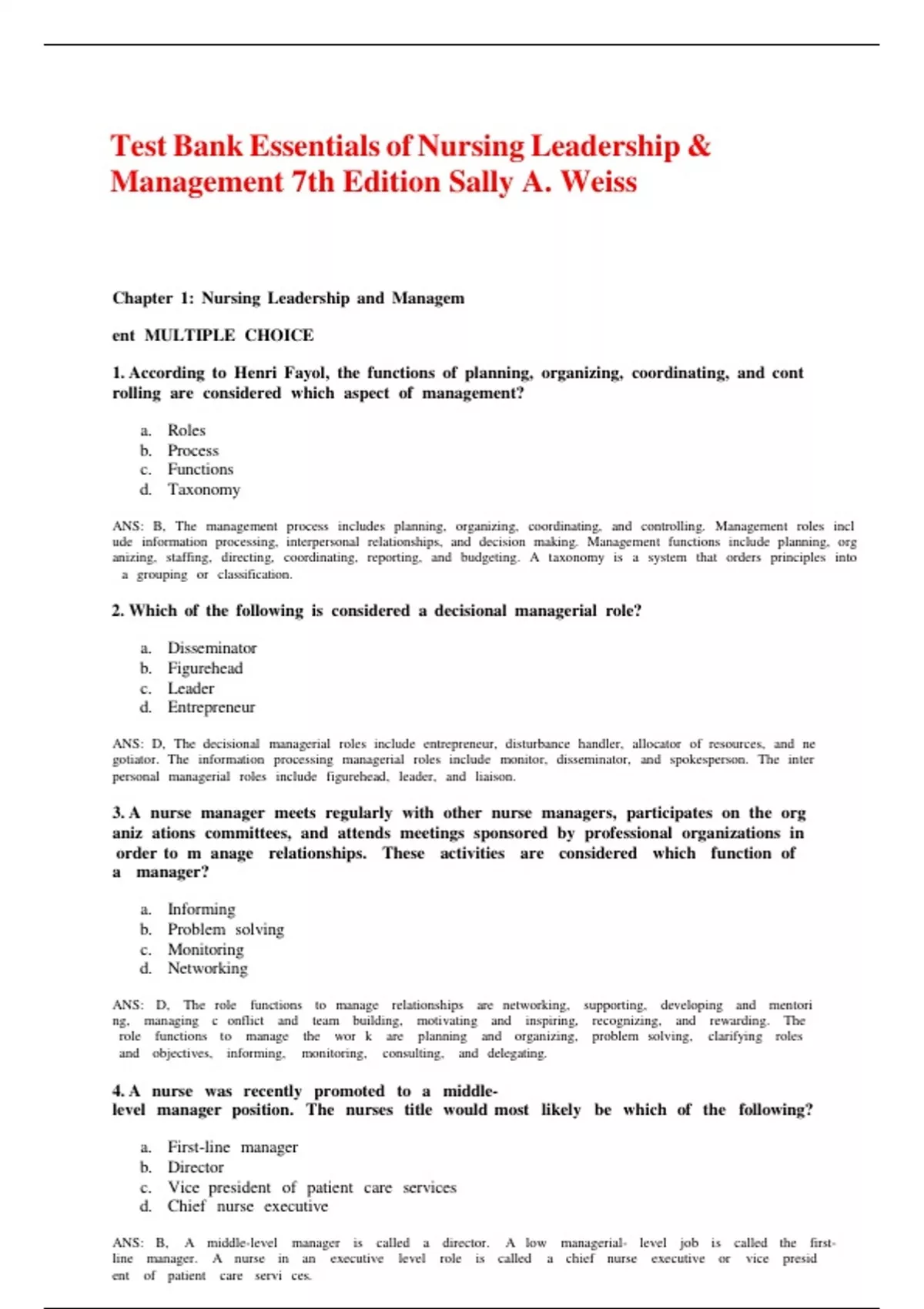 Test Bank Essentials of Nursing Leadership & Management 7th Edition Sally A. Weiss
