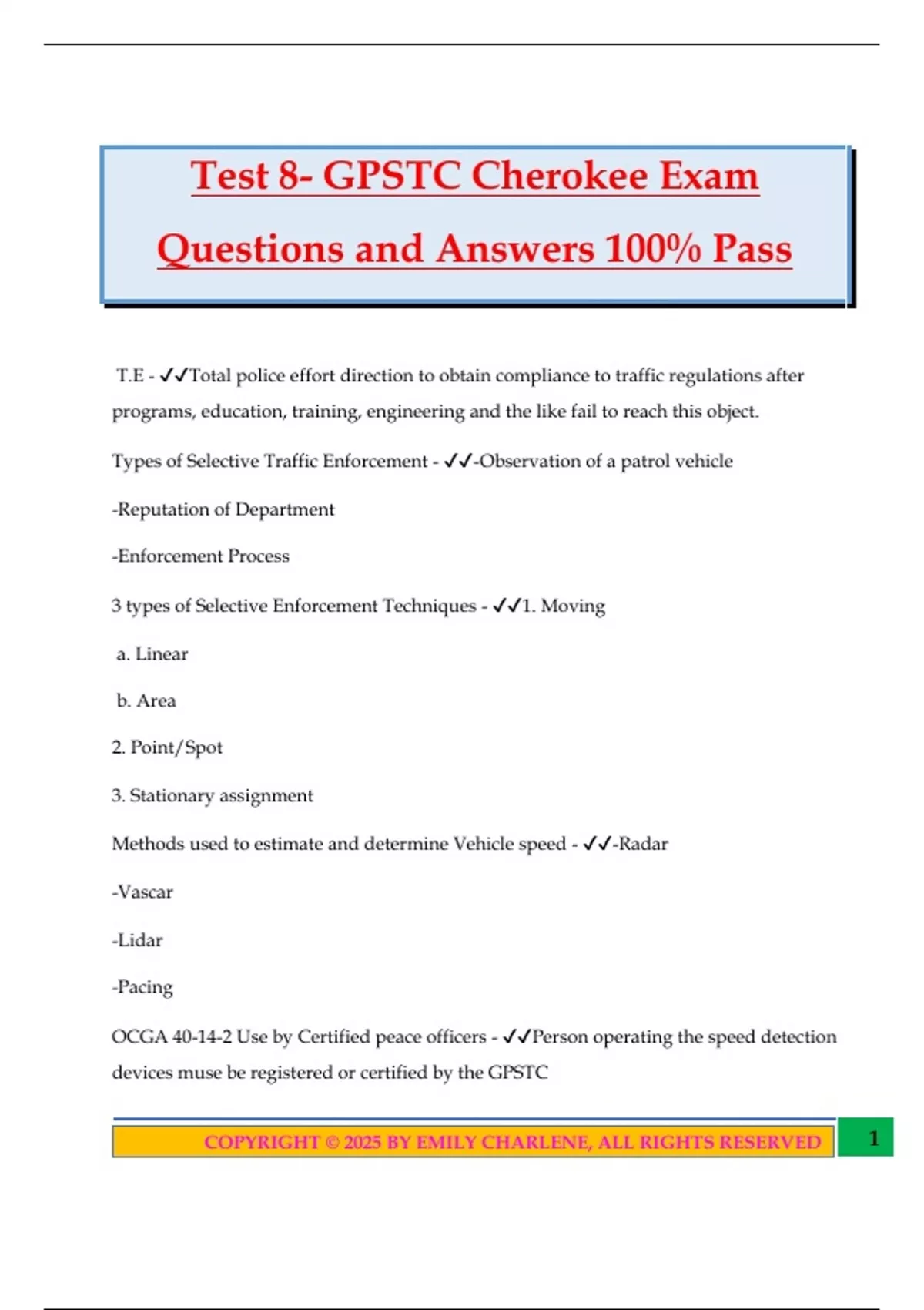 Test 8- GPSTC Cherokee Exam Questions and Answers 100% Pass T.E - Total police effort direction to obtain compliance to traffic regulations after programs, education, training, engineering and the like fail to reach this object. Types of Selective Traffic Enforcement - -Observation of a patrol vehicle -Reputation of Department -Enforcement Process 3 types of Selective Enforcement Techniques - 1. Moving a. Linear b. Area 2. Point/Spot 3. Stationary assignment Methods used to estimate and determine Vehicle speed - -Radar -Vascar -Lidar -Pacing OCGA 40-14-2 Use by Certified peace officers - Person operating the speed detection devices muse be registered or certified by the GPSTC 2COPYRIGHT © 2025 BY EMILY CHARLENE, ALL RIGHTS RESERVED OCGA 40-14-8 Use in School and residential districts - 10 miles per hour rule Officer Personalities - - The Helpful - The Authoritarian - The Aggressive - The Pacifying Driver personalities - - The cooperative - The Blameless - The Nonchalant - The Hostile A person shall not drive or be in actual physical control of any moving vehicle while: - Under the influence of alcohol, any drug, Intentional influence of any glue, aerosol, or other toxic vapor. 0.08g - Regular driver 0.04g - Moving commercial motor vehicle 0.02g - Under the age of 21 40-6-391-(l) - Endangering child by driving under influence *always make it as separate case* First and second conviction within 10 years - Misdemenor Third conviction within 10 years - Misdemeanor or a high and aggra