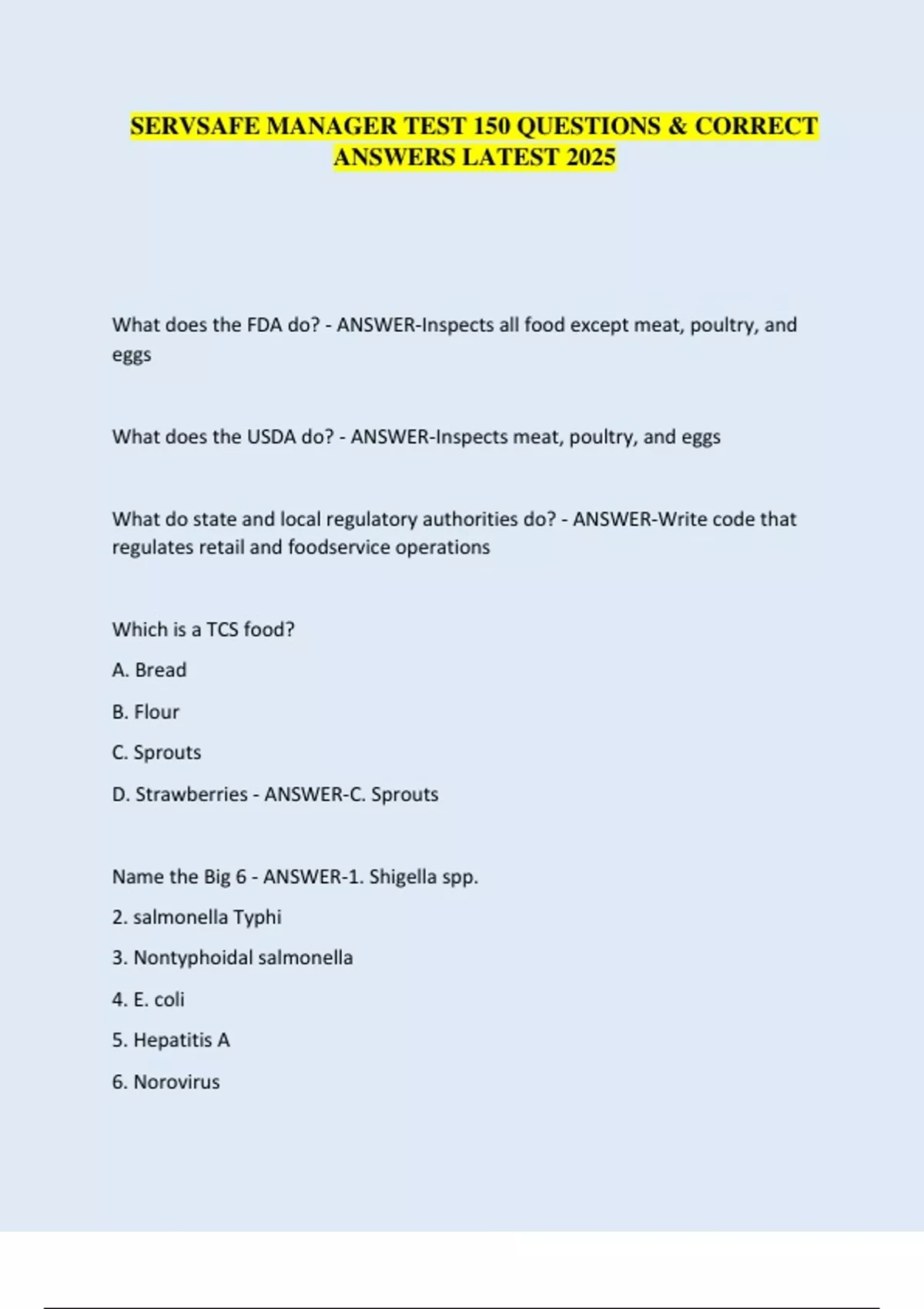 SERVSAFE MANAGER TEST 150 QUESTIONS & CORRECT