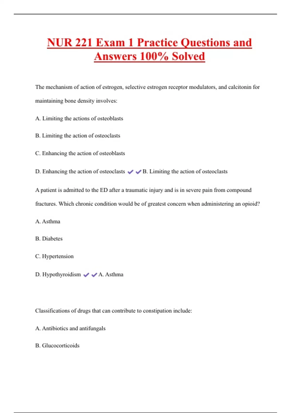 NUR 221 Exam 1 Practice Questions and Answers 100% Solved The mechanism of action of estrogen, selective estrogen receptor modulators, and calcitonin for maintaining bone density involves: A. Limiting the actions of osteoblasts B. Limiting the action of osteoclasts C. Enhancing the action of osteoblasts D. Enhancing the action of osteoclasts B. Limiting the action of osteoclasts A patient is admitted to the ED after a traumatic injury and is in severe pain from compound fractures. Which chronic condition would be of greatest concern when administering an opioid?