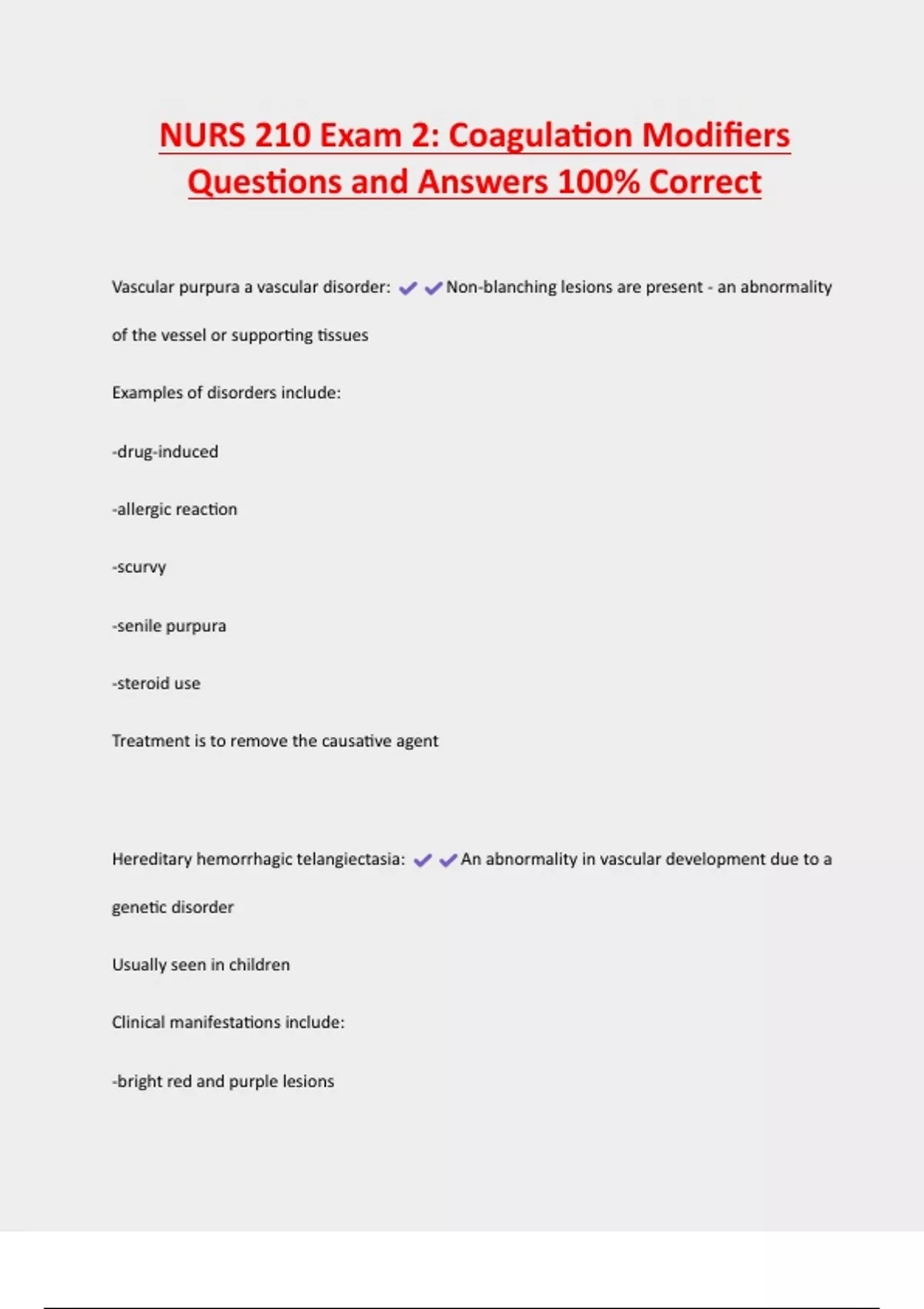 NURS 210 Exam 2: Coagulation Modifiers Questions and Answers 100% Correct Vascular purpura a vascular disorder: Non-blanching lesions are present - an abnormality of the vessel or supporting tissues Examples of disorders include: -drug-induced -allergic reaction -scurvy -senile purpura -steroid use Treatment is to remove the causative agent