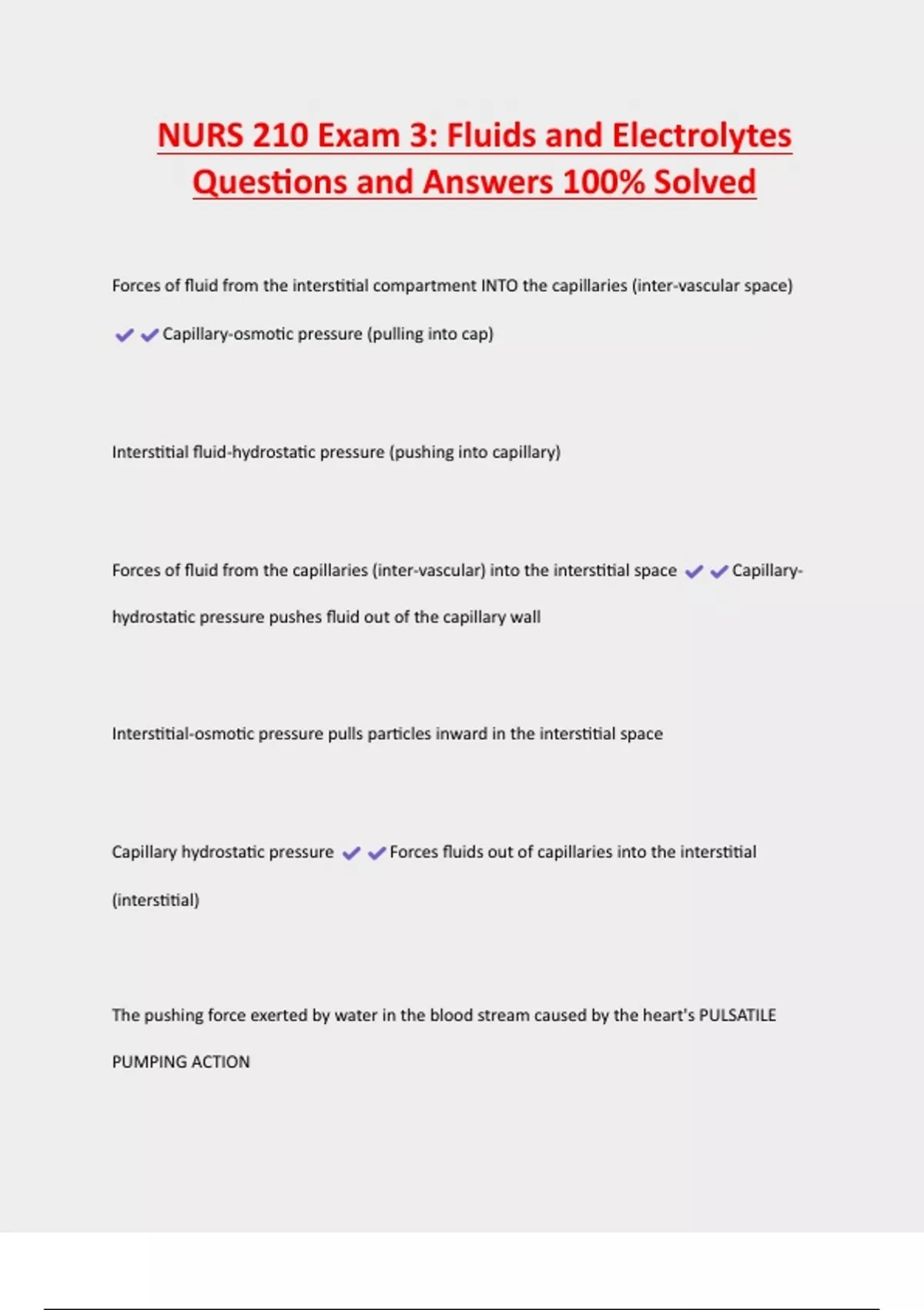 NURS 210 Exam 3: Fluids and Electrolytes Questions and Answers 100% Solved Forces of fluid from the interstitial compartment INTO the capillaries (inter-vascular space) Capillary-osmotic pressure (pulling into cap) Interstitial fluid-hydrostatic pressure (pushing into capillary) Forces of fluid from the capillaries (inter-vascular) into the interstitial space Capillaryhydrostatic pressure pushes fluid out of the capillary wall