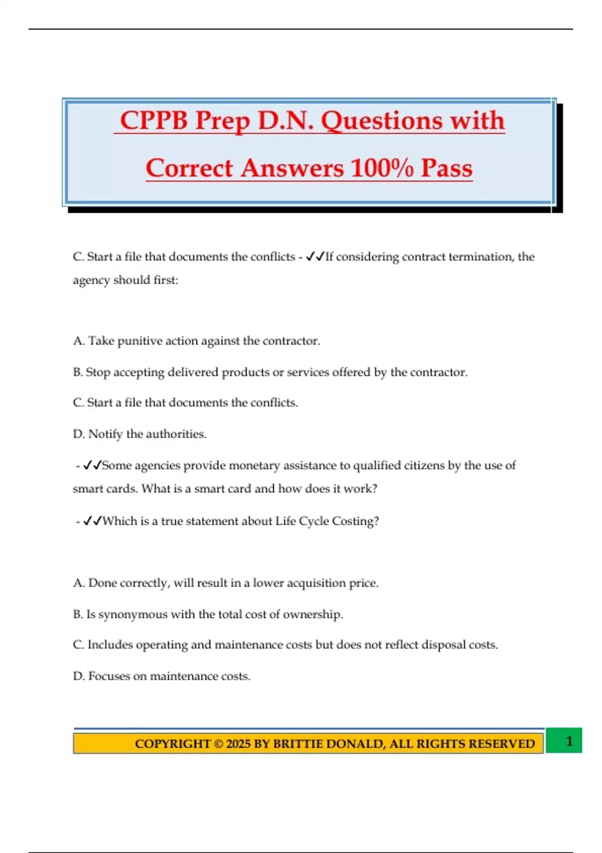 CPPB Prep D.N. Questions with Correct Answers 100% Pass C. Start a file that documents the conflicts - If considering contract termination, the agency should first: A. Take punitive action against the contractor. B. Stop accepting delivered products or services offered by the contractor. C. Start a file that documents the conflicts. D. Notify the authorities. - Some agencies provide monetary assistance to qualified citizens by the use of smart cards. What is a smart card and how does it work? - Which is a true statement about Life Cycle Costing? A. Done correctly, will result in a lower acquisition price. B. Is synonymous with the total cost of ownership. C. Includes operating and maintenance costs but does not reflect disposal costs. D. Focuses on maintenance costs. 2COPYRIGHT © 2025 BY BRITTIE DONALD, ALL RIGHTS RESERVED - A solicitation document currently on the street contains a clause that has been revised by an addendum, which then turns out to be incorrect. What happens if the bid opening date hasn't occurred yet? What happens if the bids have not been opened? Minor irregularites - Failure of a bidder to return the number of signed copies requested, failure of a bidder to acknowledge receipt of an addendum or failure to execute a required certificate are often considered: A. Deal-breakers B. Responsiveness issues C. Minor irregularities D. Major irregularities Making sure that the pricing has not changed. - You've opened some bids and identified the lowest responsive/responsible bidder. However, due to internal issues in the using department, several months have passed without the award being made. Before pressing on, what action, if any, should be taken with the low bidder? Termination for Convenience - A county has a multi-year contract to provide land use planning services for a forthcoming park renovation. Due to a severe funding shortage, all non-critical services have been put on hold for a year (at the earliest). The county has decided to cancel the contract and re-solicit the services when funding is available. Which of the following is the best cancellation method? 3COPYRIGHT © 2025 BY BRITTIE DONALD, ALL RIGHTS RESERVED A. Termination for Default B. Issuance of a Cure Notice C. Termination for Convenience D. Issuance of a Notice of Suspension A protest challenges the award or proposed award of a contract. The dispute is an issue or disagreement with the contracting officer that arises after you have won and been awarded a contract. - What's the difference b