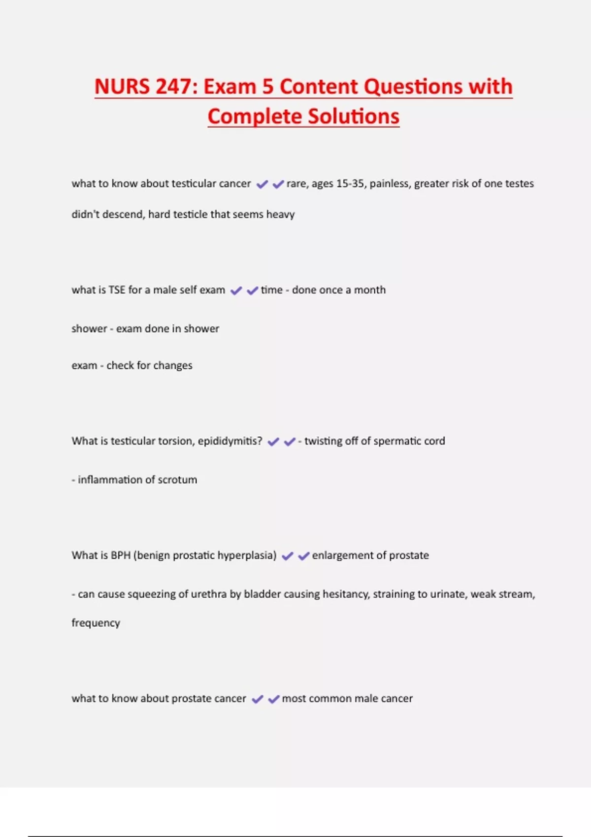 NURS 247: Exam 5 Content Questions with Complete Solutions what to know about testicular cancer rare, ages 15-35, painless, greater risk of one testes didn't descend, hard testicle that seems heavy what is TSE for a male self exam time - done once a month shower - exam done in shower exam - check for changes
