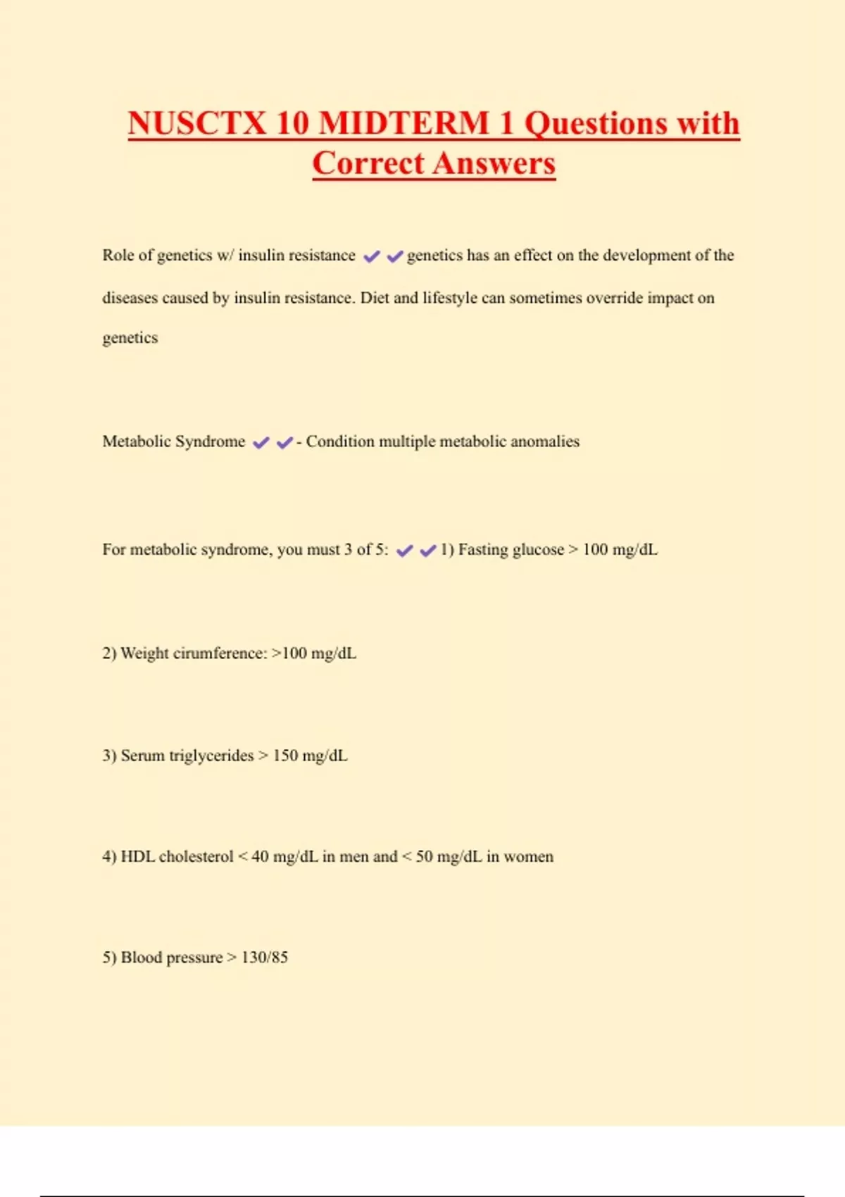 NUSCTX 10 MIDTERM 1 Questions with Correct Answers Role of genetics w/ insulin resistance genetics has an effect on the development of the diseases caused by insulin resistance. Diet and lifestyle can sometimes override impact on genetics Metabolic Syndrome - Condition multiple metabolic anomalies For metabolic syndrome, you must 3 of 5: 1) Fasting glucose 100 mg/dL