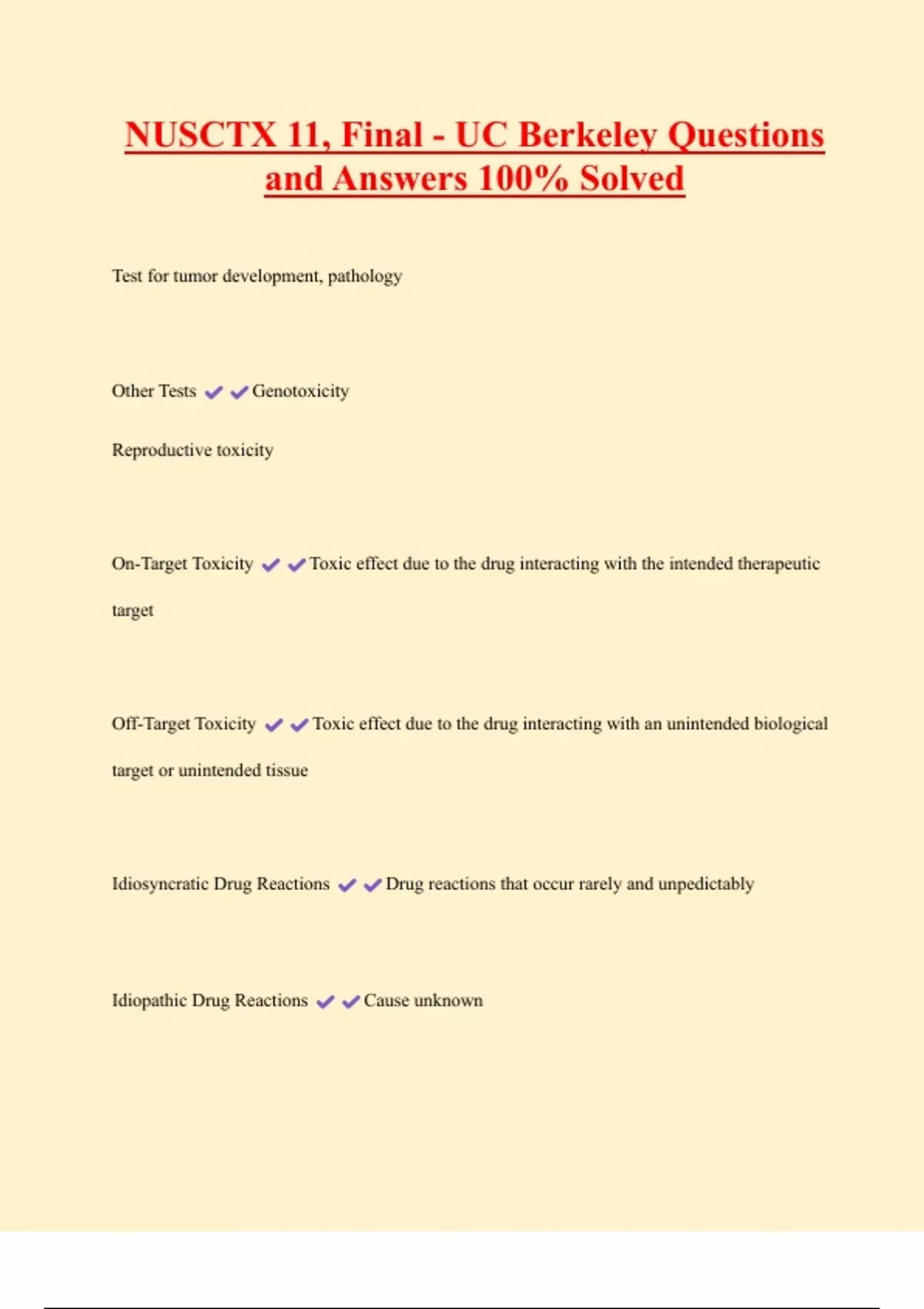 NUSCTX 11, Final - UC Berkeley Questions and Answers 100% Solved Test for tumor development, pathology Other Tests Genotoxicity Reproductive toxicity On-Target Toxicity Toxic effect due to the drug interacting with the intended therapeutic target