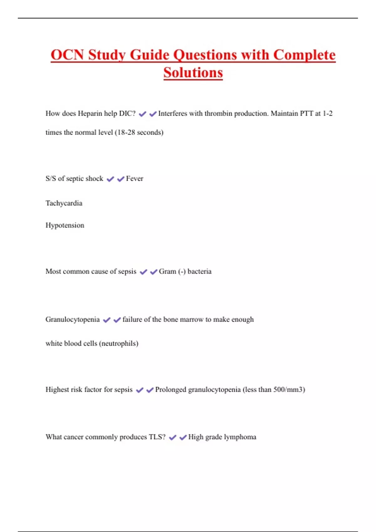 OCN Study Guide Questions with Complete Solutions How does Heparin help DIC? Interferes with thrombin production. Maintain PTT at 1-2 times the normal level (18-28 seconds) S/S of septic shock Fever Tachycardia Hypotension