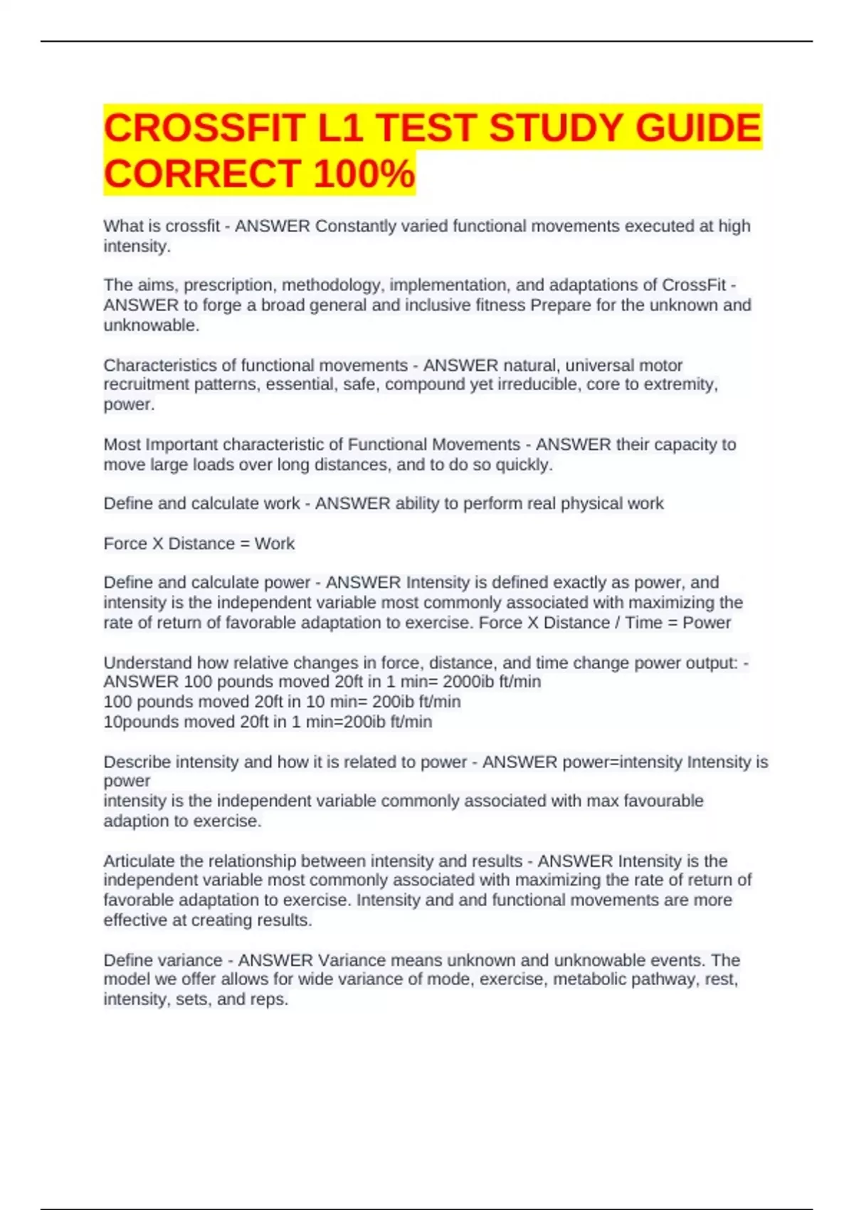 CROSSFIT L1 TEST STUDY GUIDE CORRECT 100%