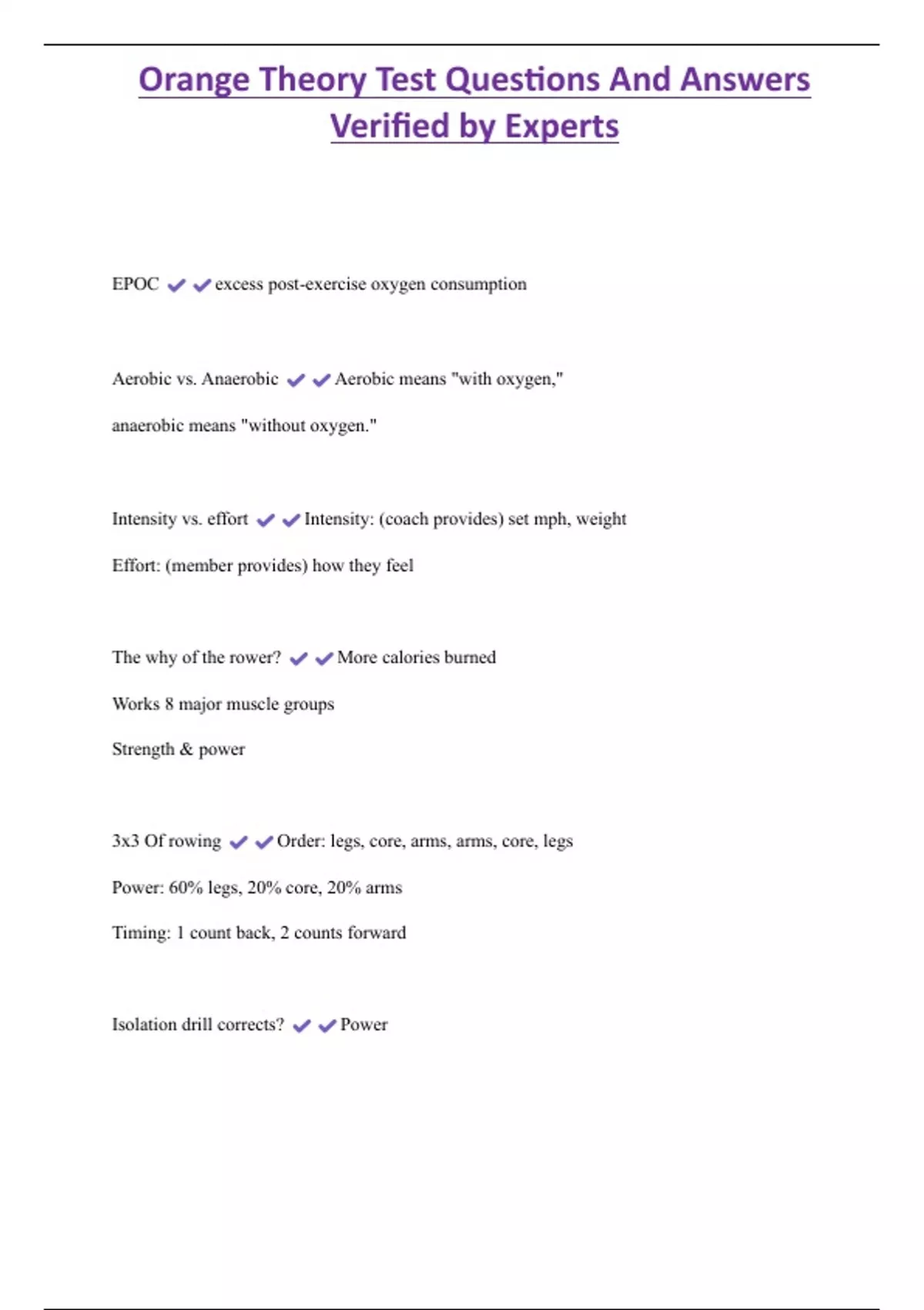 Orange Theory Test Questions And Answers Verified by Experts EPOC excess post-exercise oxygen consumption Aerobic vs. Anaerobic Aerobic means "with oxygen," anaerobic means "without oxygen." Intensity vs. effort Intensity: (coach provides) set mph, weight Effort: (member provides) how they feel