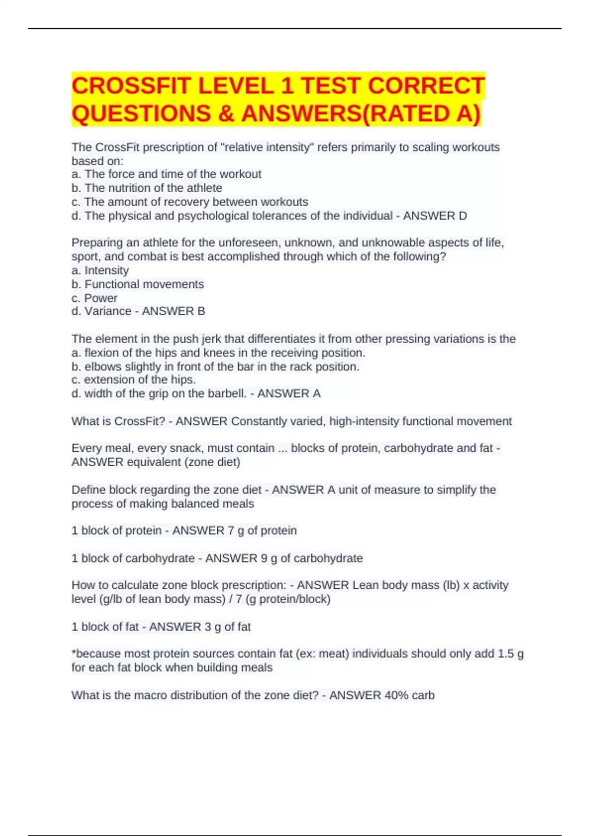 The CrossFit prescription of "relative intensity" refers primarily to scaling workouts based on: a. The force and time of the workout b. The nutrition of the athlete c. The amount of recovery between workouts d. The physical and psychological tolerances of the individual - ANSWER D Preparing an athlete for the unforeseen, unknown, and unknowable aspects of life, sport, and combat is best accomplished through which of the following? a. Intensity b. Functional movements c. Power d. Variance - ANSWER B The element in the push jerk that differentiates it from other pressing variations is the a. flexion of the hips and knees in the receiving position. b. elbows slightly in front of the bar in the rack position. c. extension of the hips. d. width of the grip on the barbell. - ANSWER A
