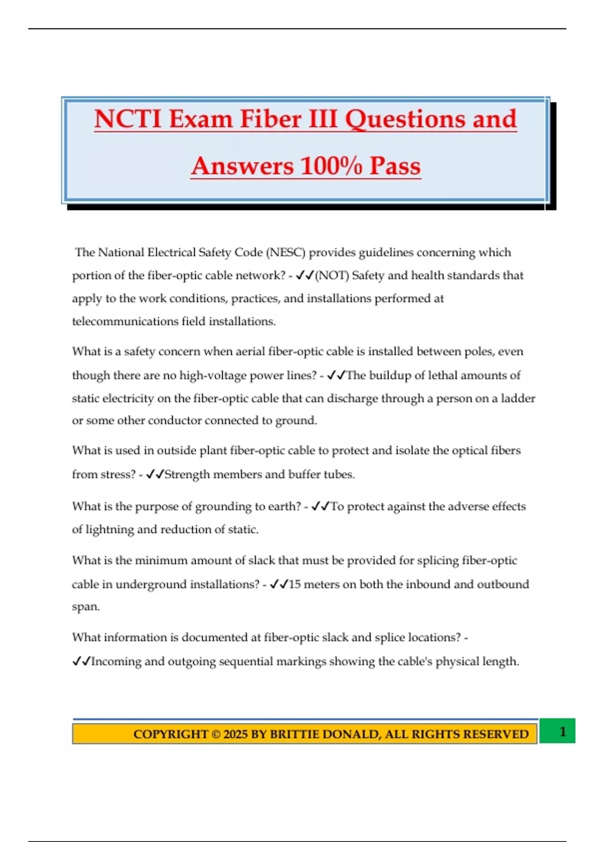 NCTI Exam Fiber III Questions and Answers 100% Pass The National Electrical Safety Code (NESC) provides guidelines concerning which portion of the fiber-optic cable network? - (NOT) Safety and health standards that apply to the work conditions, practices, and installations performed at telecommunications field installations. What is a safety concern when aerial fiber-optic cable is installed between poles, even though there are no high-voltage power lines? - The buildup of lethal amounts of static electricity on the fiber-optic cable that can discharge through a person on a ladder or some other conductor connected to ground. What is used in outside plant fiber-optic cable to protect and isolate the optical fibers from stress? - Strength members and buffer tubes. What is the purpose of grounding to earth? - To protect against the adverse effects of lightning and reduction of static. What is the minimum amount of slack that must be provided for splicing fiber-optic cable in underground installations? - 15 meters on both the inbound and outbound span. What information is documented at fiber-optic slack and splice locations? - Incoming and outgoing sequential markings showing the