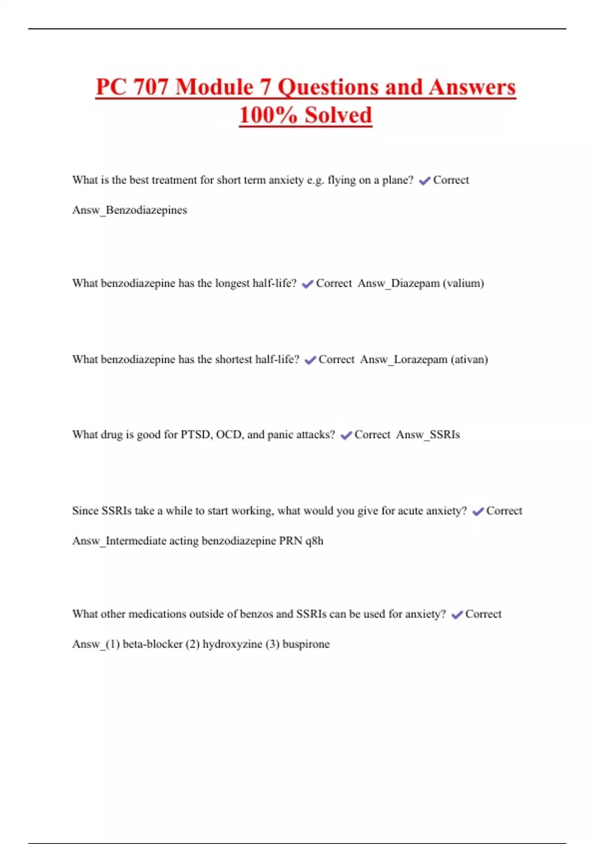 PC 707 Module 7 Questions and Answers 100% Solved What is the best treatment for short term anxiety e.g. flying on a plane? Correct Answ_Benzodiazepines What benzodiazepine has the longest half-life? Correct Answ_Diazepam (valium) What benzodiazepine has the shortest half-life? Correct Answ_Lorazepam (ativan