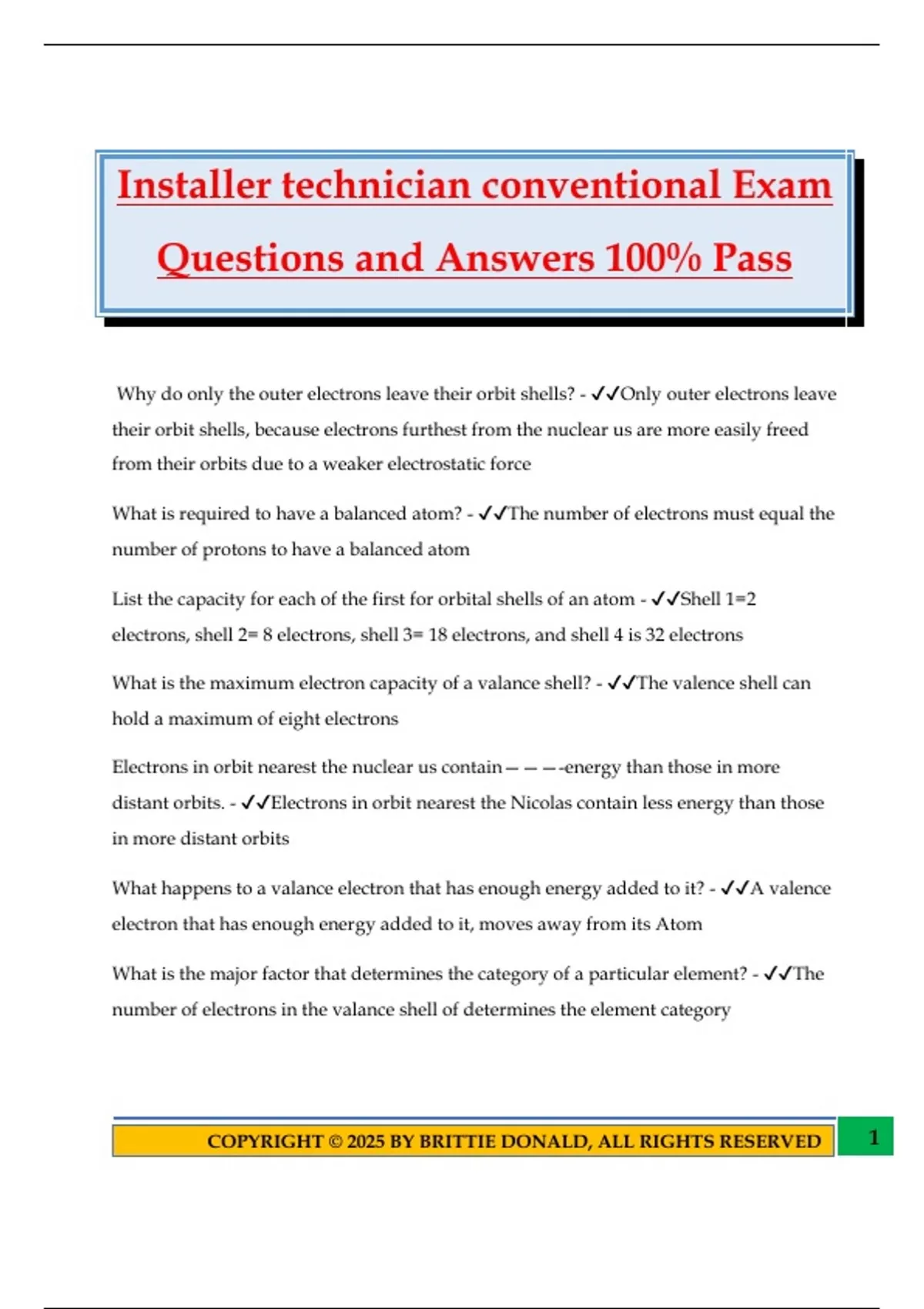 Installer technician conventional Exam Questions and Answers 100% Pass Why do only the outer electrons leave their orbit shells? - Only outer electrons leave their orbit shells, because electrons furthest from the nuclear us are more easily freed from their orbits due to a weaker electrostatic force What is required to have a balanced atom? - The number of electrons must equal the number of protons to have a balanced atom List the capacity for each of the first for orbital shells of an atom - Shell 1=2 electrons, shell 2= 8 electrons, shell 3= 18 electrons, and shell 4 is 32 electrons What is the maximum electron capacity of a valance shell? - The valence shell can hold a maximum of eight electrons Electrons in orbit nearest the nuclear us contain———-energy than those in more distant orbits. - Electrons in orbit nearest the Nicolas contain less energy than those in more distant orbits What happens to a valance electron that has enough energy added to it? - A valence electron that has enough energy added to it, moves away from its Atom What is the major factor that determines the category of a particular element? - The number of electrons in the valance shell of determines the element category 2COPYRIGHT © 2025 BY BRITTIE DONALD, ALL RIGHTS RESERVED How many valence electrons are there in a good conductor? - Good conductor has only one or two valence electrons List, gold, silver, and copper in the order of the best connectivity - Silver, copper, gold Why do metals that each have only one valence electron differ in their conductivity - Metals that each have one valance electron differ in their conductivity, because of the way their atoms pack together into a solid structure Describe the two characteristics of an insulator - The two characteristics of an insulator are its valence Shell is almost filled and tends to be fairly stable and two it, tries to finish, filling its valance shell by capturing additional free electrons. How many valence electrons are in a semiconductor - A se