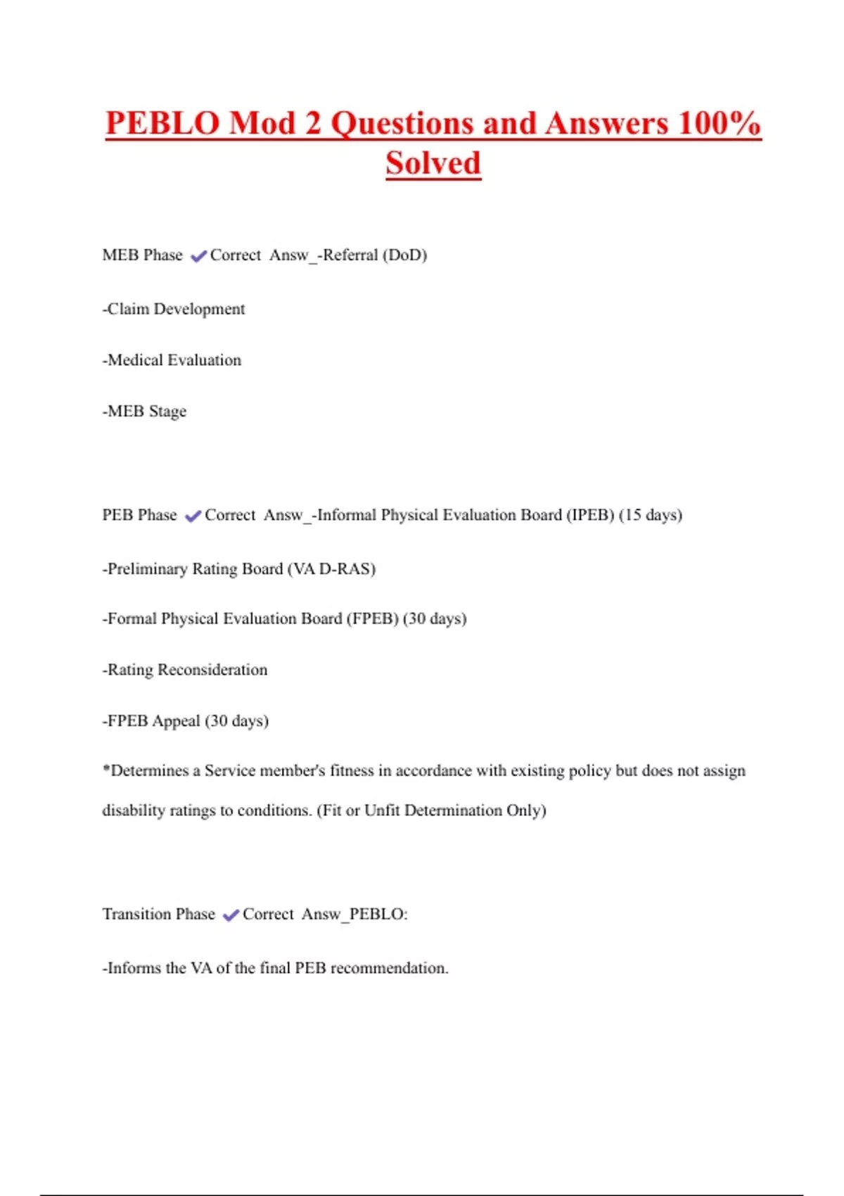 PEBLO Mod 2 Questions and Answers 100% Solved MEB Phase Correct Answ_-Referral (DoD) -Claim Development -Medical Evaluation -MEB Stage