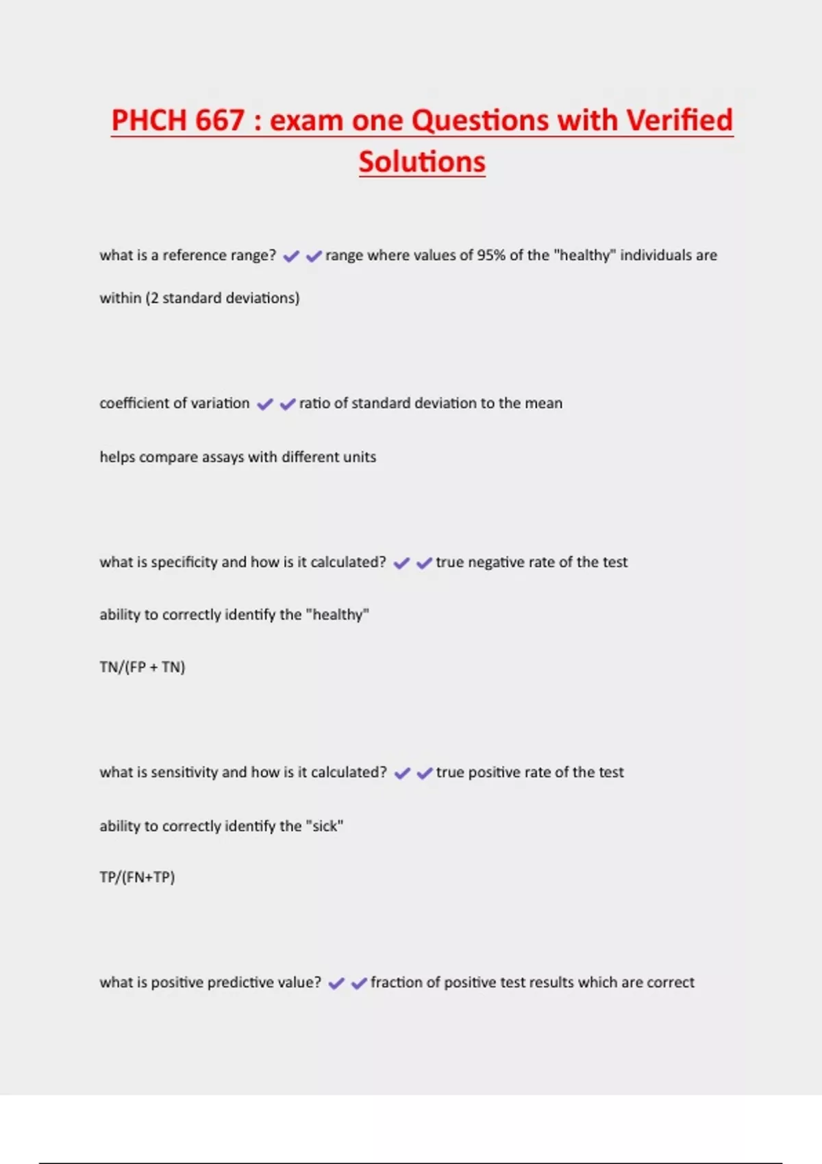 PHCH 667 : exam one Questions with Verified Solutions what is a reference range? range where values of 95% of the "healthy" individuals are within (2 standard deviations) coefficient of variation ratio of standard deviation to the mean helps compare assays with different units