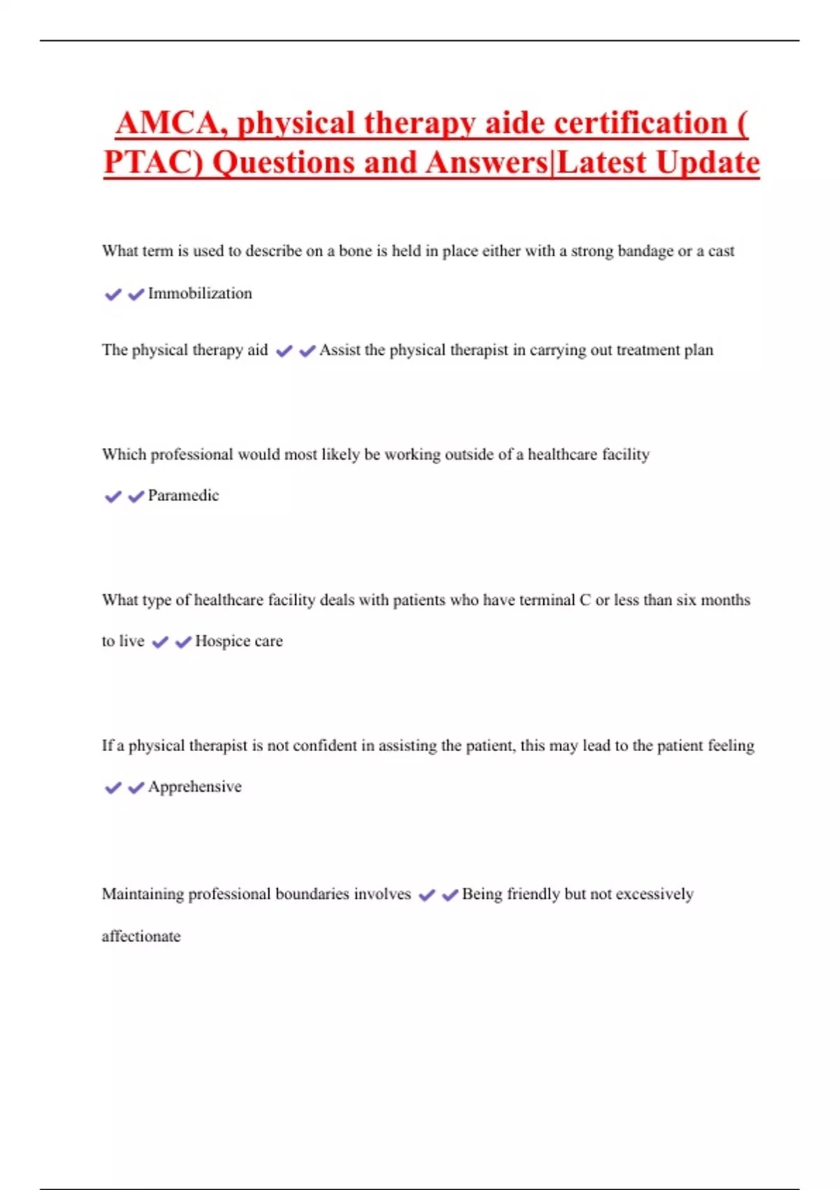 AMCA, physical therapy aide certification ( PTAC) Questions and Answers|Latest Update What term is used to describe on a bone is held in place either with a strong bandage or a cast Immobilization The physical therapy aid Assist the physical therapist in carrying out treatment plan Which professional would most likely be working outside of a healthcare facility Paramedic