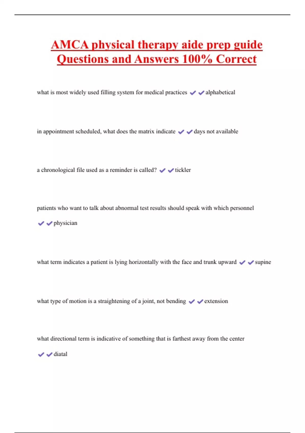AMCA physical therapy aide prep guide Questions and Answers 100% Correct what is most widely used filling system for medical practices alphabetical in appointment scheduled, what does the matrix indicate days not available a chronological file used as a reminder is called? tickler
