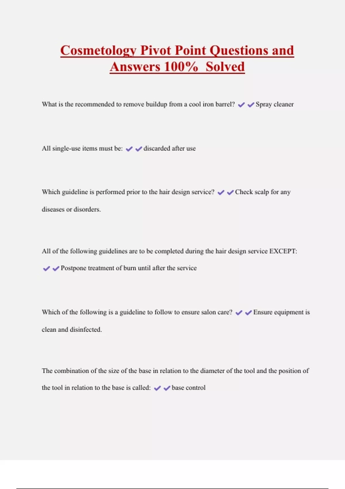 Cosmetology Pivot Point Questions and Answers 100% Solved What is the recommended to remove buildup from a cool iron barrel? Spray cleaner All single-use items must be: discarded after use Which guideline is performed prior to the hair design service? Check scalp for any diseases or disorders. All of the following guidelines are to be completed during the hair design service EXCEPT: Postpone treatment of burn until after the service Which of the following is a guideline to follow to ensure salon care? Ensure equipment is clean and disinfected.