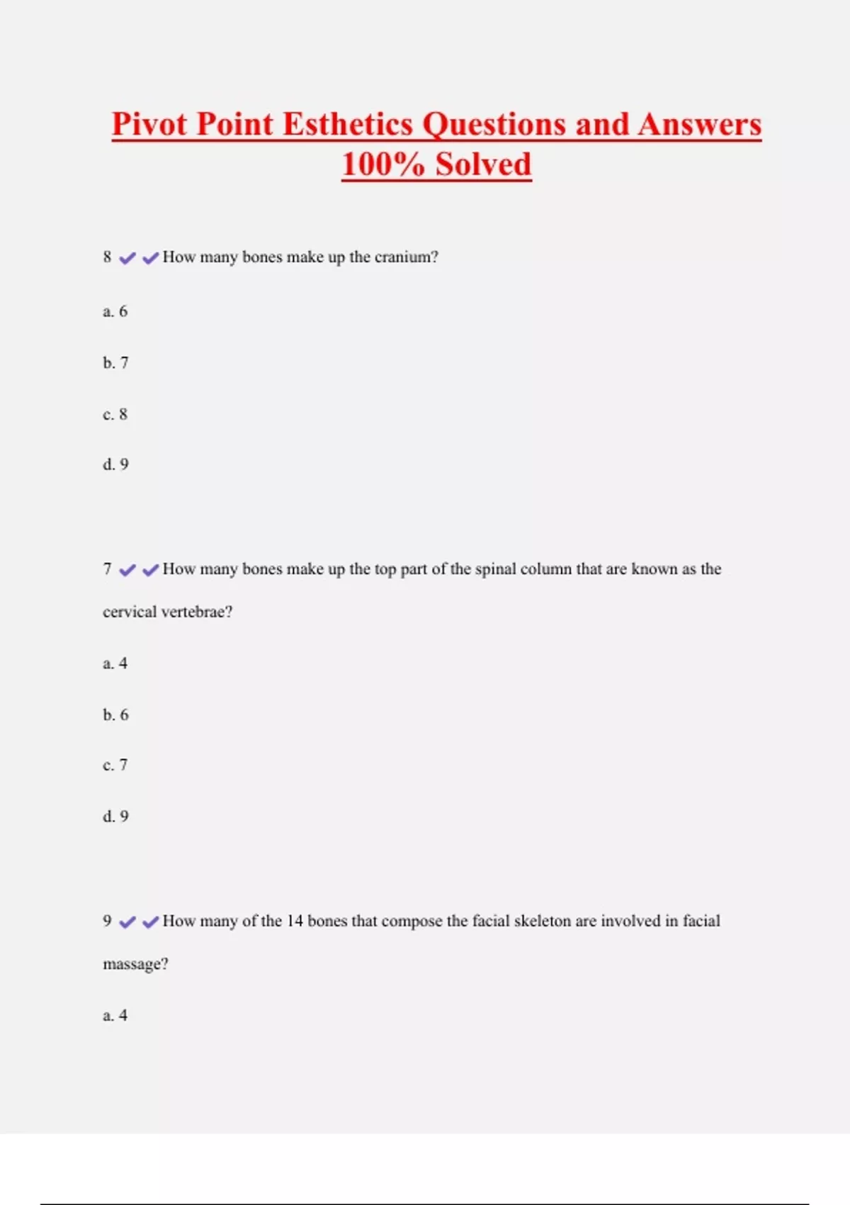 Pivot Point Esthetics Questions and Answers 100% Solved 8 How many bones make up the cranium? a. 6 b. 7 c. 8 d. 9 7 How many bones make up the top part of the spinal column that are known as the cervical vertebrae? a. 4 b. 6 c. 7 d. 9