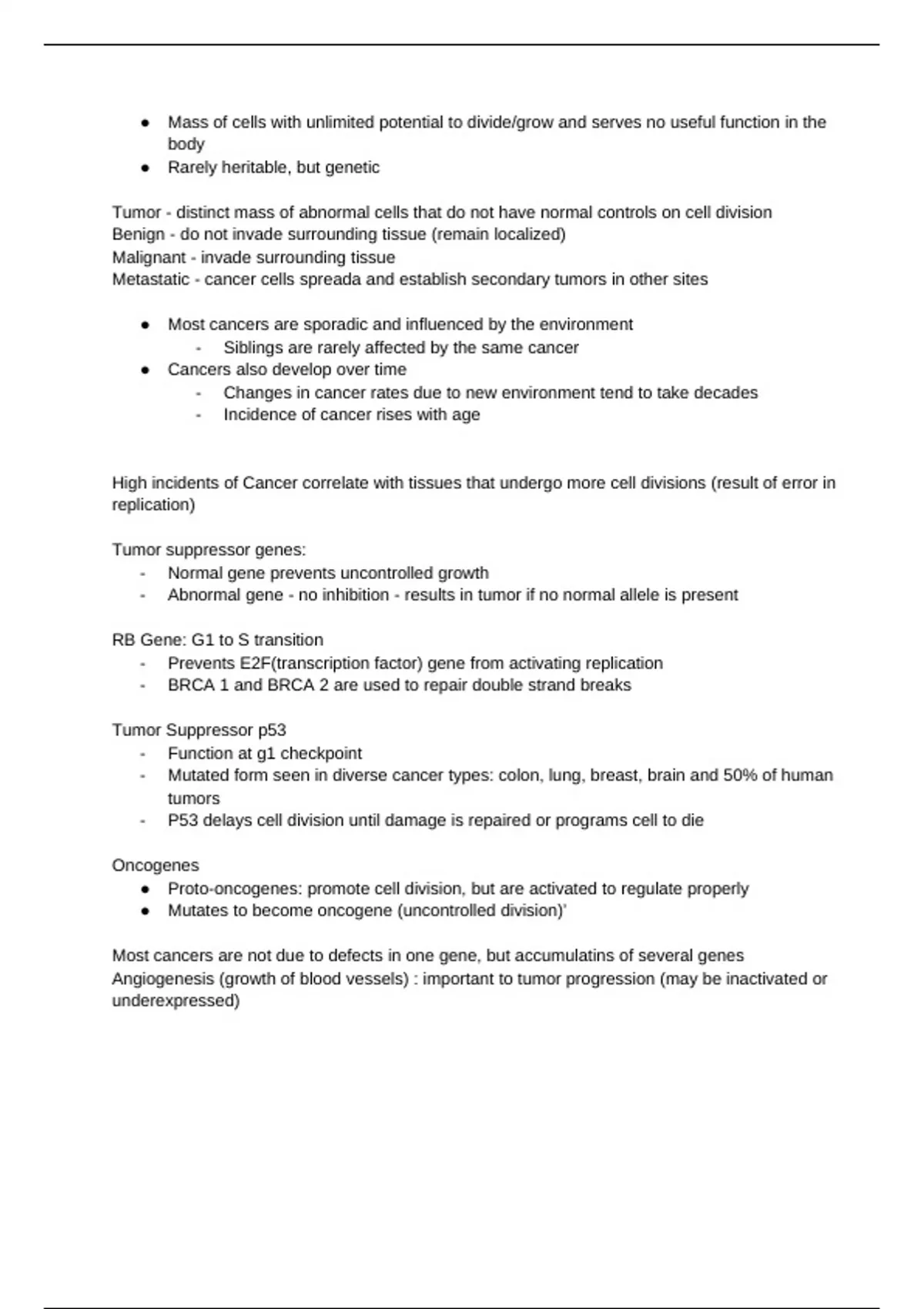This document provides an overview of the biological foundations of cancer, focusing on the genetic and cellular processes involved in tumor development and progression. It covers the differences between benign, malignant, and metastatic tumors, highlights the role of environmental factors and age in cancer incidence, and explains how cell division errors contribute to cancer. Key genetic components are discussed, including tumor suppressor genes (e.g., p53, RB, BRCA1/2) and oncogenes, along with the concept of angiogenesis in tumor growth. The document emphasizes that most cancers result from the accumulation of mutations in multiple genes over time.