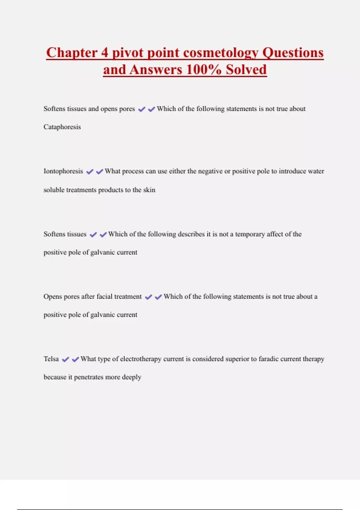 Chapter 4 pivot point cosmetology Questions and Answers 100% Solved Softens tissues and opens pores Which of the following statements is not true about Cataphoresis Iontophoresis What process can use either the negative or positive pole to introduce water soluble treatments products to the skin Softens tissues Which of the following describes it is not a temporary affect of the positive pole of galvanic current