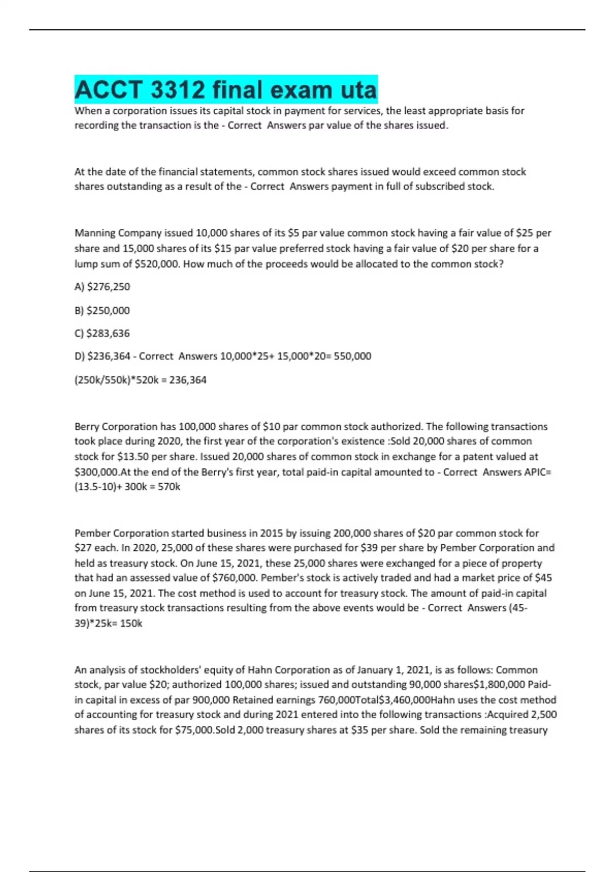 from treasury stock transactions resulting from the above events would be - Correct Answers (45-