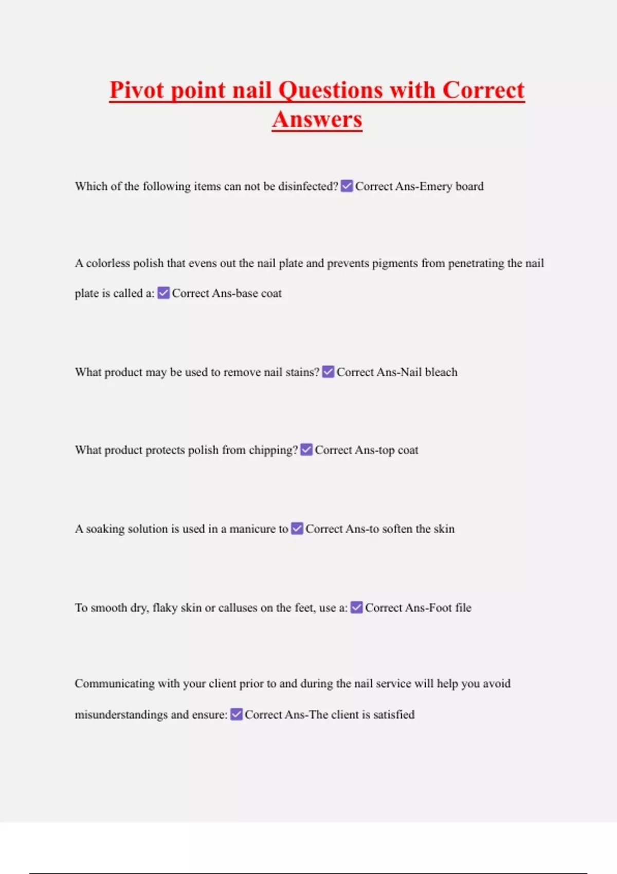 Pivot point nail Questions with Correct Answers Which of the following items can not be disinfected? Correct Ans-Emery board A colorless polish that evens out the nail plate and prevents pigments from penetrating the nail plate is called a: Correct Ans-base coat What product may be used to remove nail stains? Correct Ans-Nail bleach What product protects polish from chipping? Correct Ans-top coat A soaking solution is used in a manicure to Correct Ans-to soften the skin