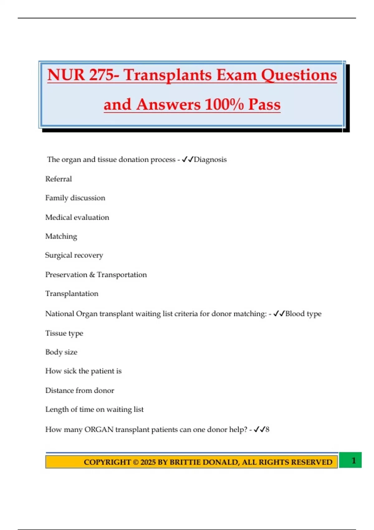 NUR 275- Transplants Exam Questions and Answers 100% Pass The organ and tissue donation process - Diagnosis Referral Family discussion Medical evaluation Matching Surgical recovery Preservation & Transportation Transplantation National Organ transplant waiting list criteria for donor matching: - Blood type Tissue type Body size How sick the patient is Distance from donor Length of time on waiting list How many ORGAN transplant patients can one donor help? - 8 2COPYRIGHT © 2025 BY BRITTIE DONALD, ALL RIGHTS RESERVED How many TISSUE transplant patients can one donor help? - 50 What ORGANS can be donated? - Heart Lungs Liver Kidneys Pancreas Intestines What TISSUES can be donated? - Skin Bone Connective tissue (ligaments/tendons) Heart valves Arteries Veins Corneas Preoperative Phase: Labs - CBC PT/PTT CMP U/A Type & screen (tissue/blood typing) AB screen 3COPYRIGHT © 2025 BY BRITTIE DONALD, ALL RIGHTS RESERVED Electrolytes Preoperative Phase: Dialysis - 24 hours before surgery Preoperative Phase: Imaging - CXR ECG Preoperative Phase: Kidney - Labs Physical evaluation Dental exam Psychosocial evaluation Dialysis Patient Education T/F: Old kidneys can be left in the body during transplantation of a new kidney - True Postoperative phase: Kidney - Assess Kidney F