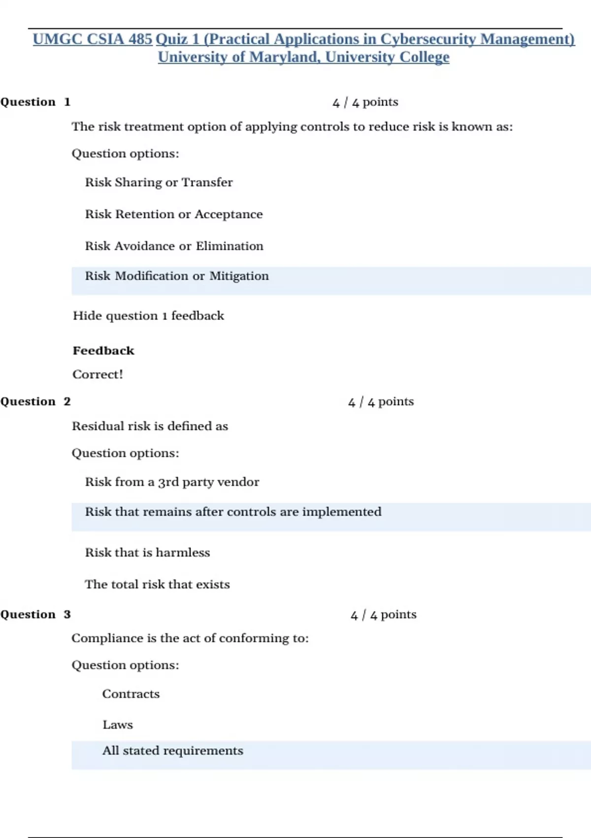 UMGC CSIA 485 Quiz 1 (Practical Applications in Cybersecurity Management) University of Maryland, University College