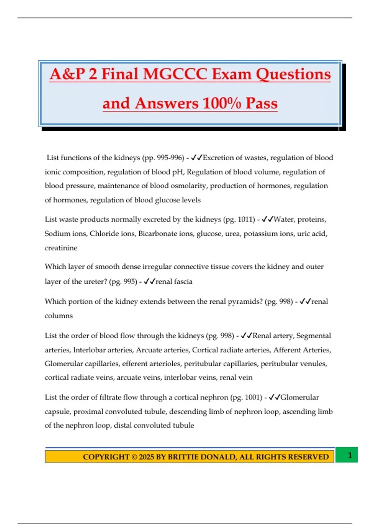 A&P 2 Final MGCCC Exam Questions and Answers 100% Pass List functions of the kidneys (pp. 995-996) - Excretion of wastes, regulation of blood ionic composition, regulation of blood pH, Regulation of blood volume, regulation of blood pressure, maintenance of blood osmolarity, production of hormones, regulation of hormones, regulation of blood glucose levels List waste products normally excreted by the kidneys (pg. 1011) - Water, proteins, Sodium ions, Chloride ions, Bicarbonate ions, glucose, urea, potassium ions, uric acid, creatinine Which layer of smooth dense irregular connective tissue covers the kidney and outer layer of the ureter? (pg. 995) - renal fascia Which portion of the kidney extends between the renal pyramids? (pg. 998) - renal columns List the order of blood flow through the kidneys (pg. 998) - Renal artery, Segmental arteries, Interlobar arteries, Arcuate arteries, Cortical radiate arteries, Afferent Arteries, Glomerular capillaries, efferent arterioles, peritubular capillaries, peritubular venules, cortical radiate veins, arcuate veins, interlobar veins, renal vein List the order of filtrate flow through a cortical nephron (pg. 1001) - Glomerular capsule, proximal convoluted tubule, descending limb of nephron loop, ascending limb of the nephron loop, distal convoluted tubule 2COPYRIGHT © 2025 BY BRITTIE DONALD, ALL RIGHTS RESERVED Which nephron structure reabsorbs the most substances? (pg. 1010) - proximal convoluted tubule Which nephron structure filters blood plasma? (pg. 999) - glomerulus What is reabsorption? (pg. 1005) - the process by which the nephron removes water and solutes from the tubular fluid and returns them to the circulating blood What is tubular secretion? (pg. 1005) - the transfer of materials from peritubular capillaries to the renal tubular lumen; it is the opposite process of reabsorption What is the basement membrane? (pg. 1007) - thin, dense sheets of specialized, self- assembled extracellular matrix that surround most animal tissues What is myogenic mechanism? (pg. 1008) - how arteries and arterioles react to an increase or decrease of blood pressure to keep the blood flow constant within the blood vessel What is a transcellular reabsorption route? (pg. 1011) - passes from fluid in tubular lumen THROUGH apical membrane of a tubule cell, acros