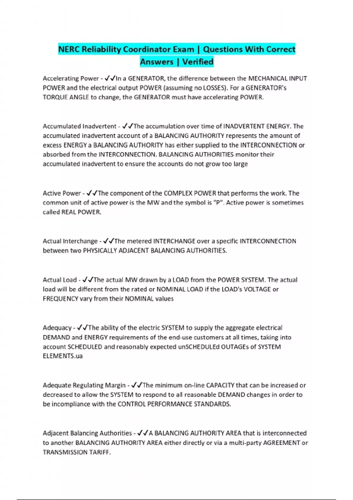 NERC Reliability Coordinator Exam | Questions With Correct Answers | Verified